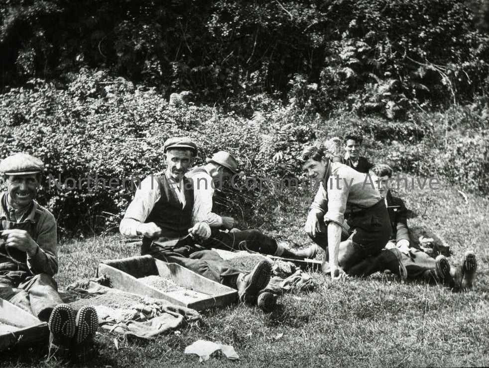 Group of men and boys sitting on grass baiting lines for eels