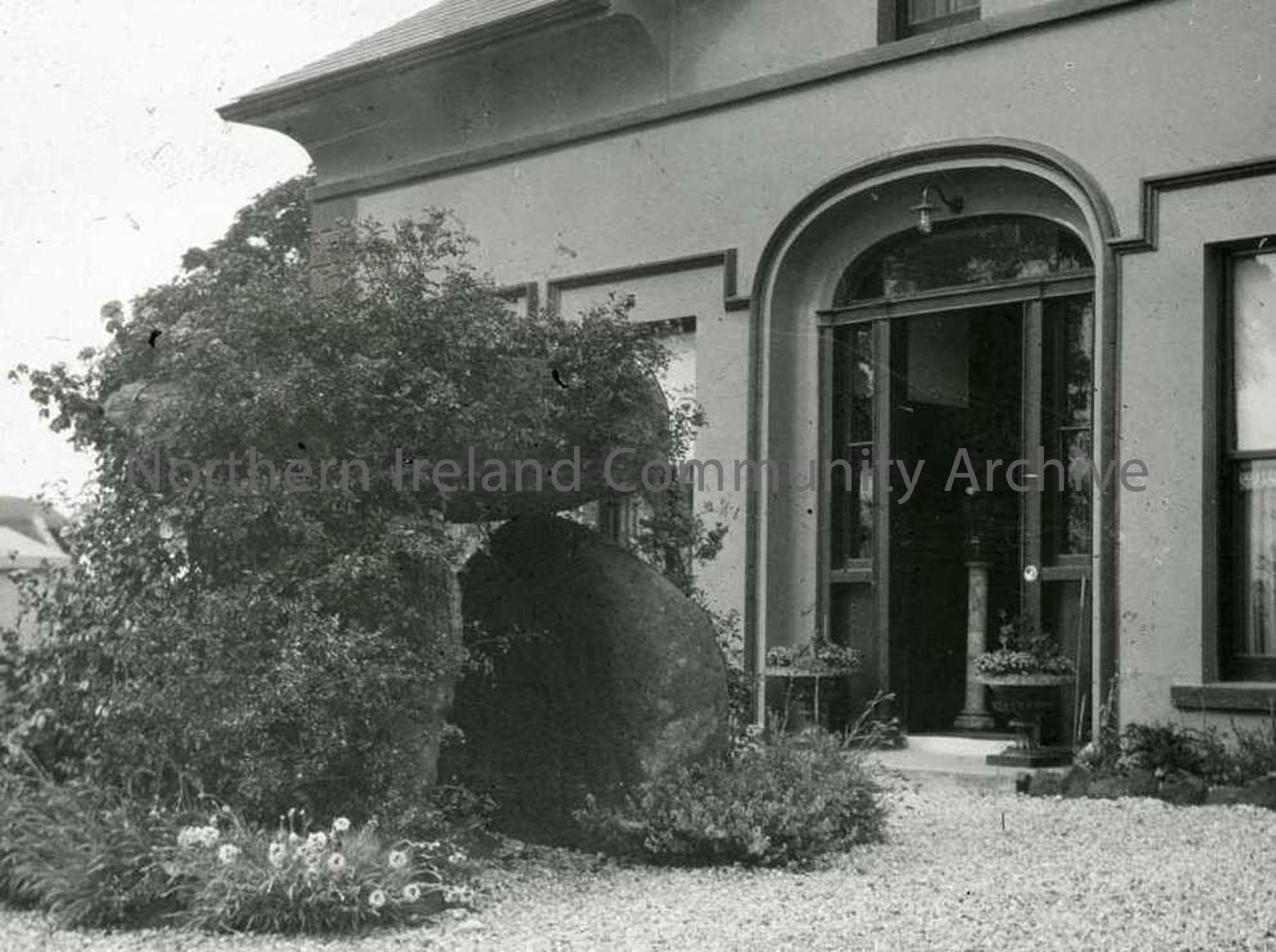 Ballylumford, Islandmagee, Co.Antrim. Megalith in front of a house, known as "Ballylumford Dolmen".