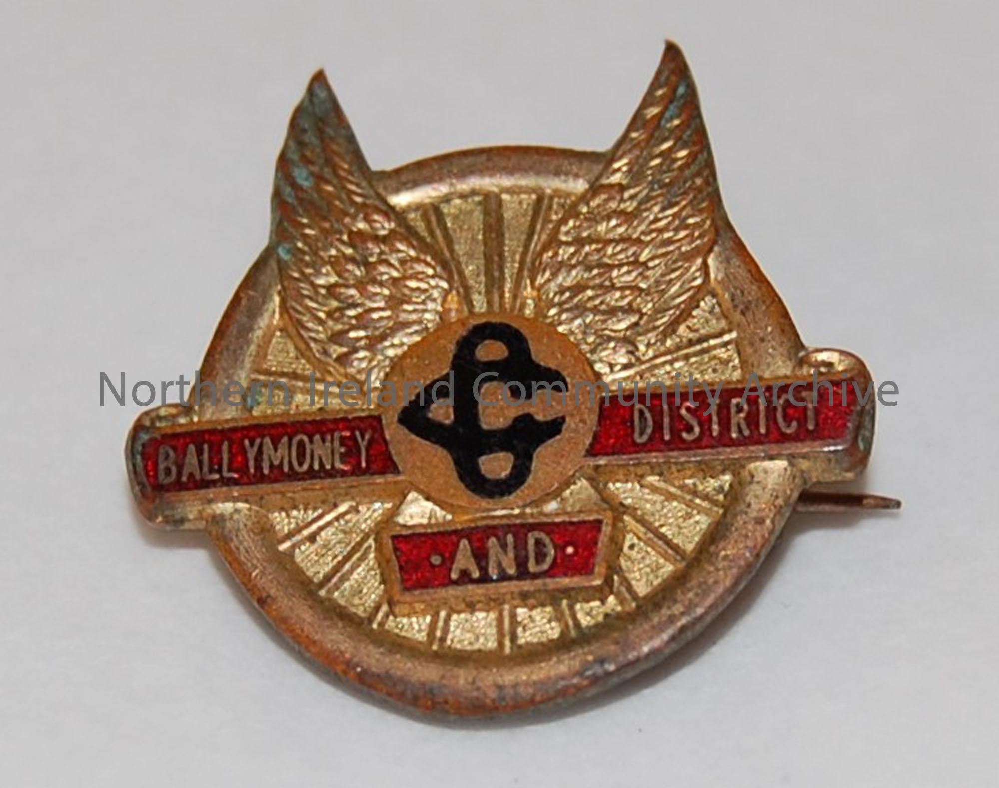 Ballymoney and District Cycle Club badge. Circular, brass, pair of wings on bicycle wheel, with red band bearing inscription and logo- 2 conjoined ‘C’…