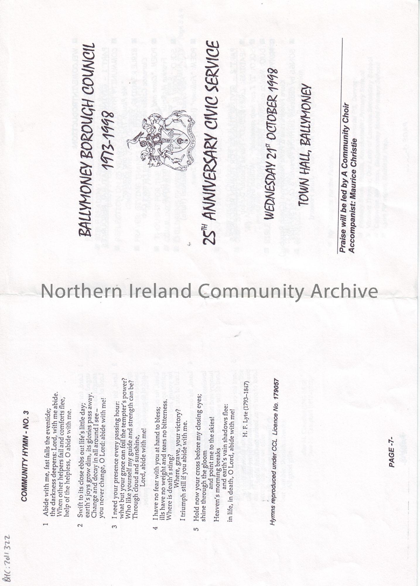 Ballymoney Borough Council 1973-1998. 25th Anniversary civic service wednesday 21st October 1998, Town Hall, Ballymoney