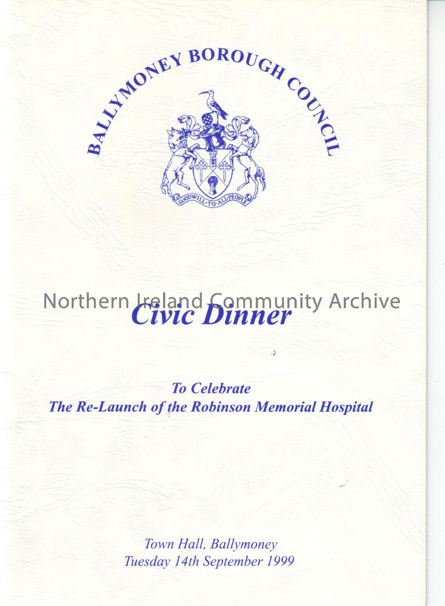 Ballymoney Borough Council Civic dinner to celebrate the re-launch of the Robincon Memorial Hospital. Town Hall, Ballymoney Tuesday 14th September 1999