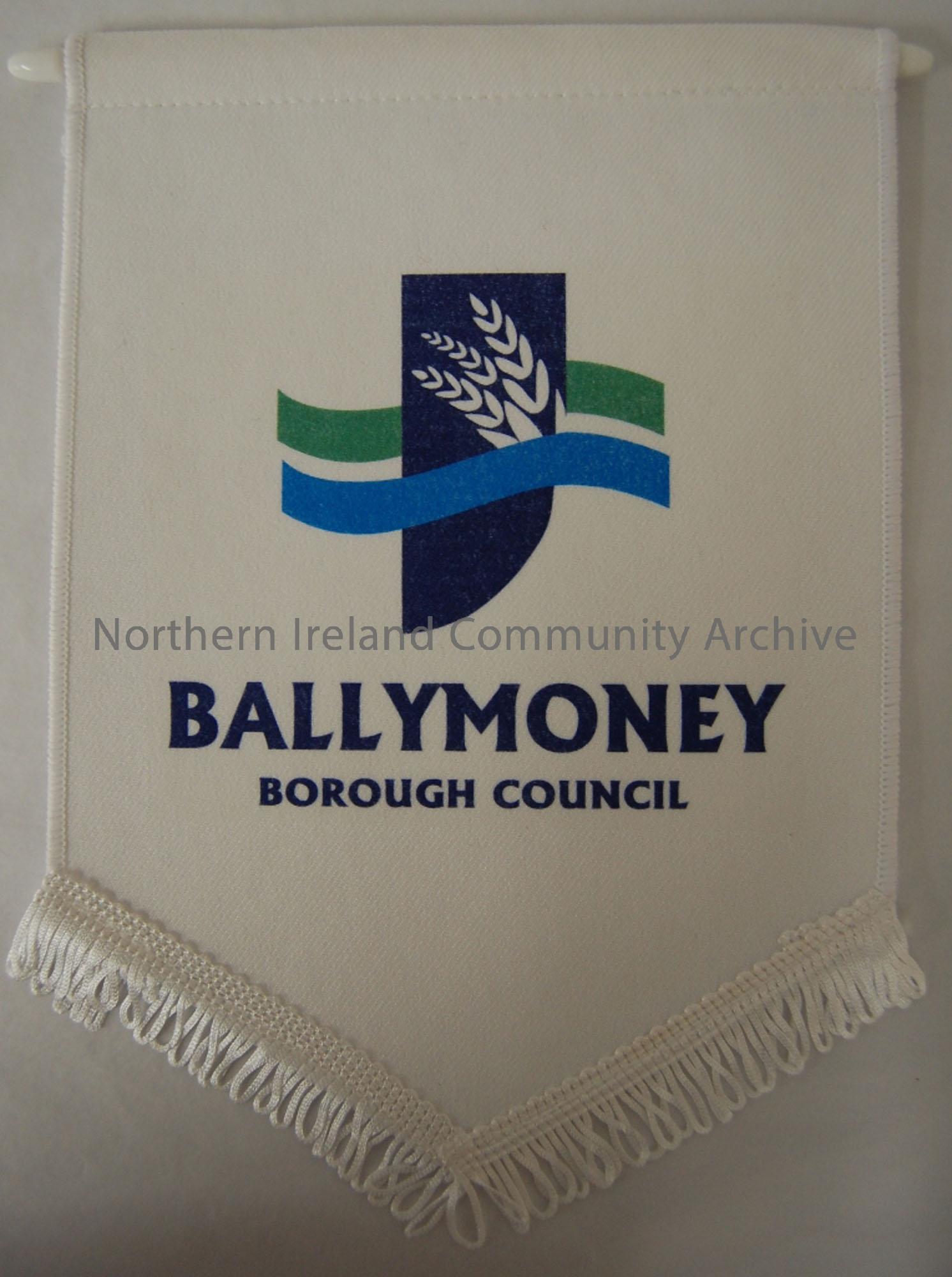 Ballymoney borough council flag associated with the official opening of the refurbished and extended Town Hall, Thursday 23rd February 2006. white,angled bottom with white fringe and emblem