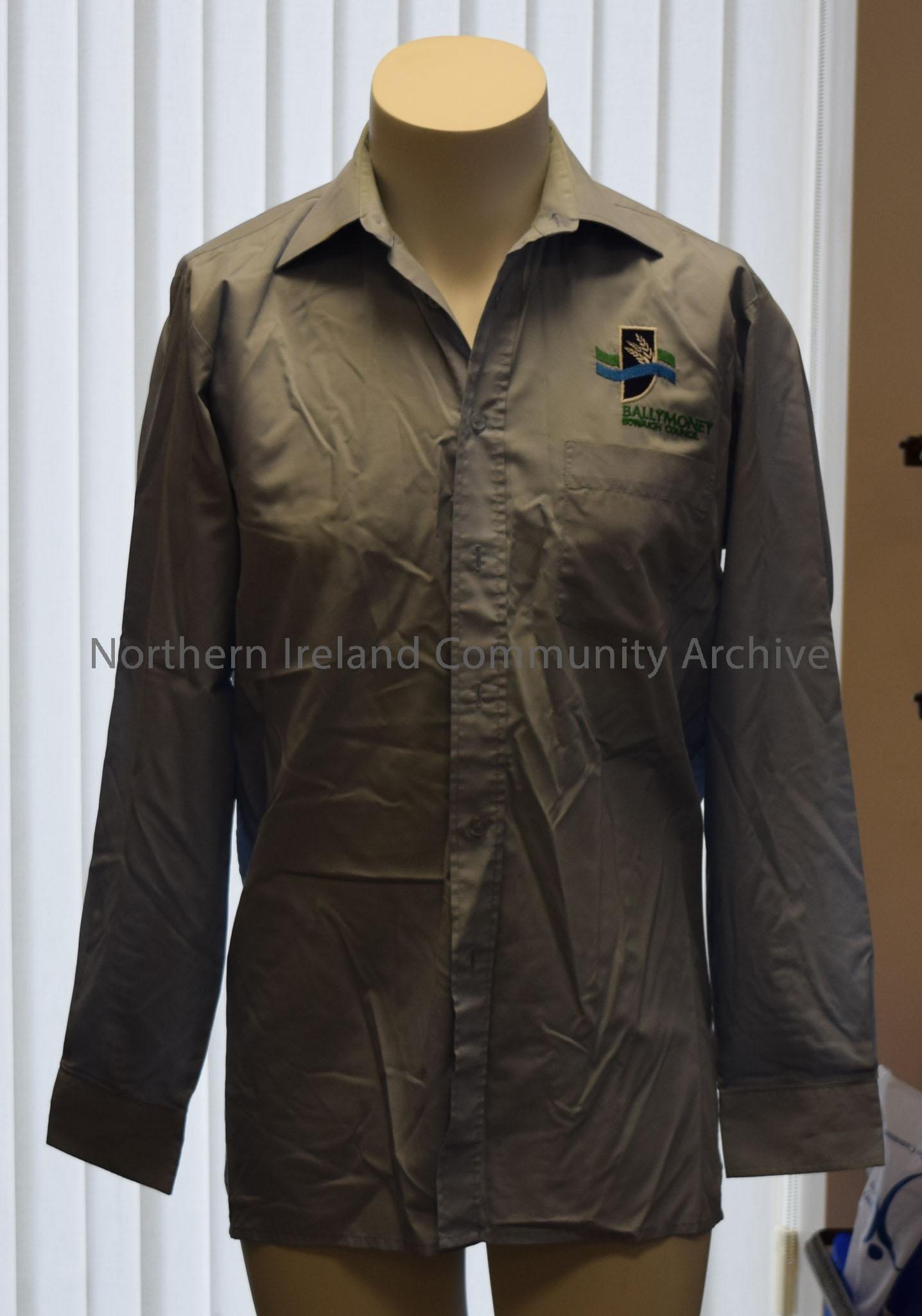 Ballymoney Borough Council shirt. Pale blue with blue, green and white council logo of three heads of wheat.