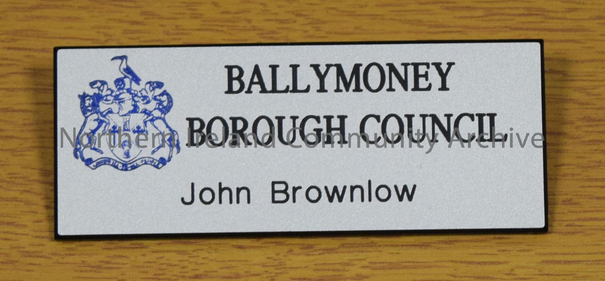 Ballymoney Borough Council staff badge belonging to John Brownlow. Silver rectangular badge with blue crest and black writing.