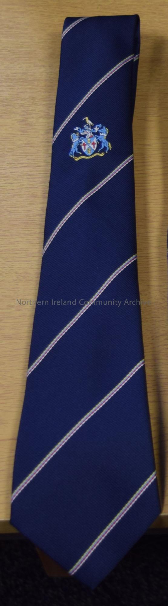 Ballymoney Borough Council tie. Navy blue with thin diagonal yellow, white, red and blue stripes. Ballymoney coat of arms with two horses either side …