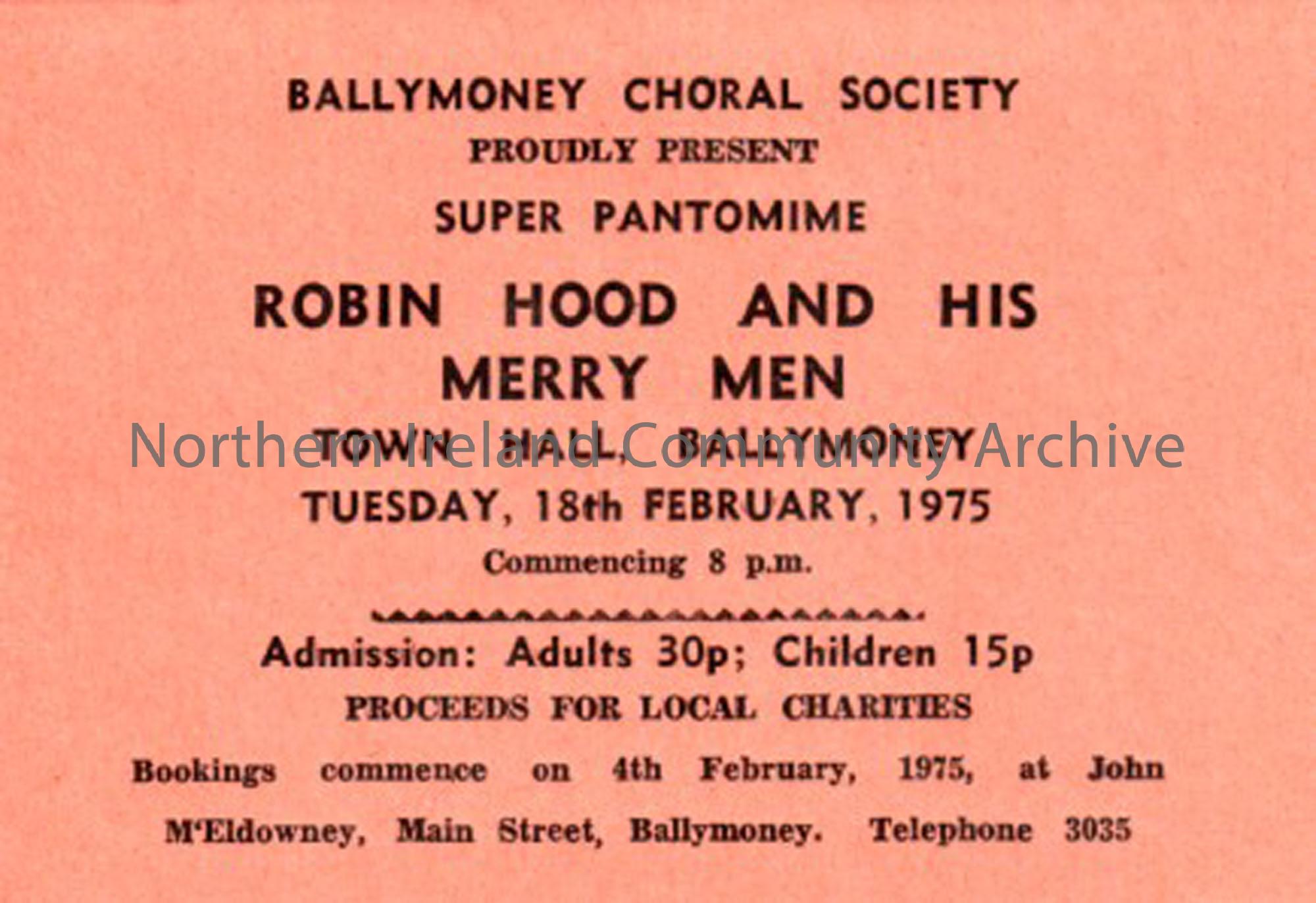Ballymoney Choral Society orange ticket for Robin Hood and his Merry Men, Town Hall, Ballymoney, Tuesday 18th February, 1975.