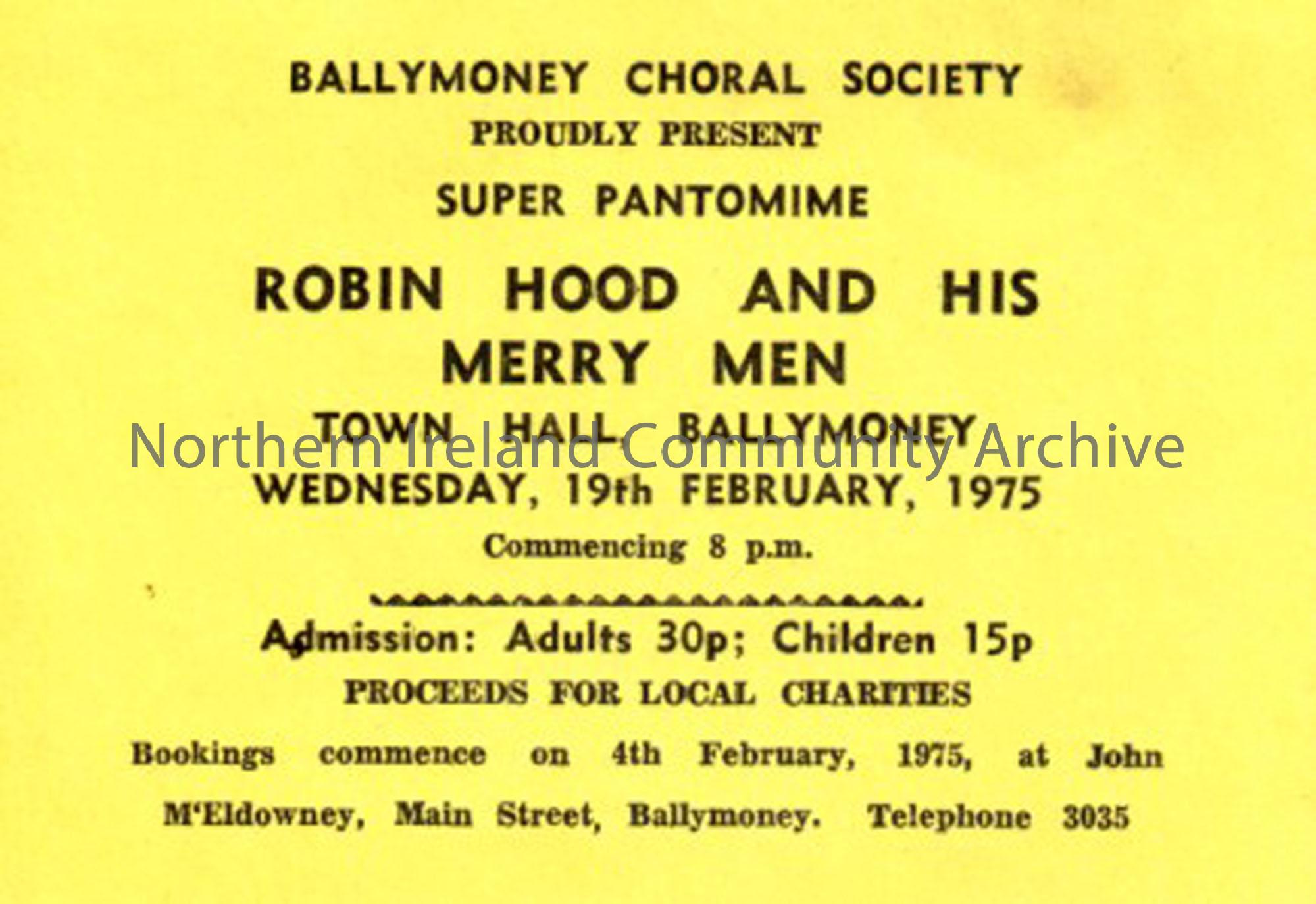 Ballymoney Choral Society yellow ticket for Robin Hood and his Merry Men, Town Hall, Ballymoney, Wednesday, 19th February, 1975.