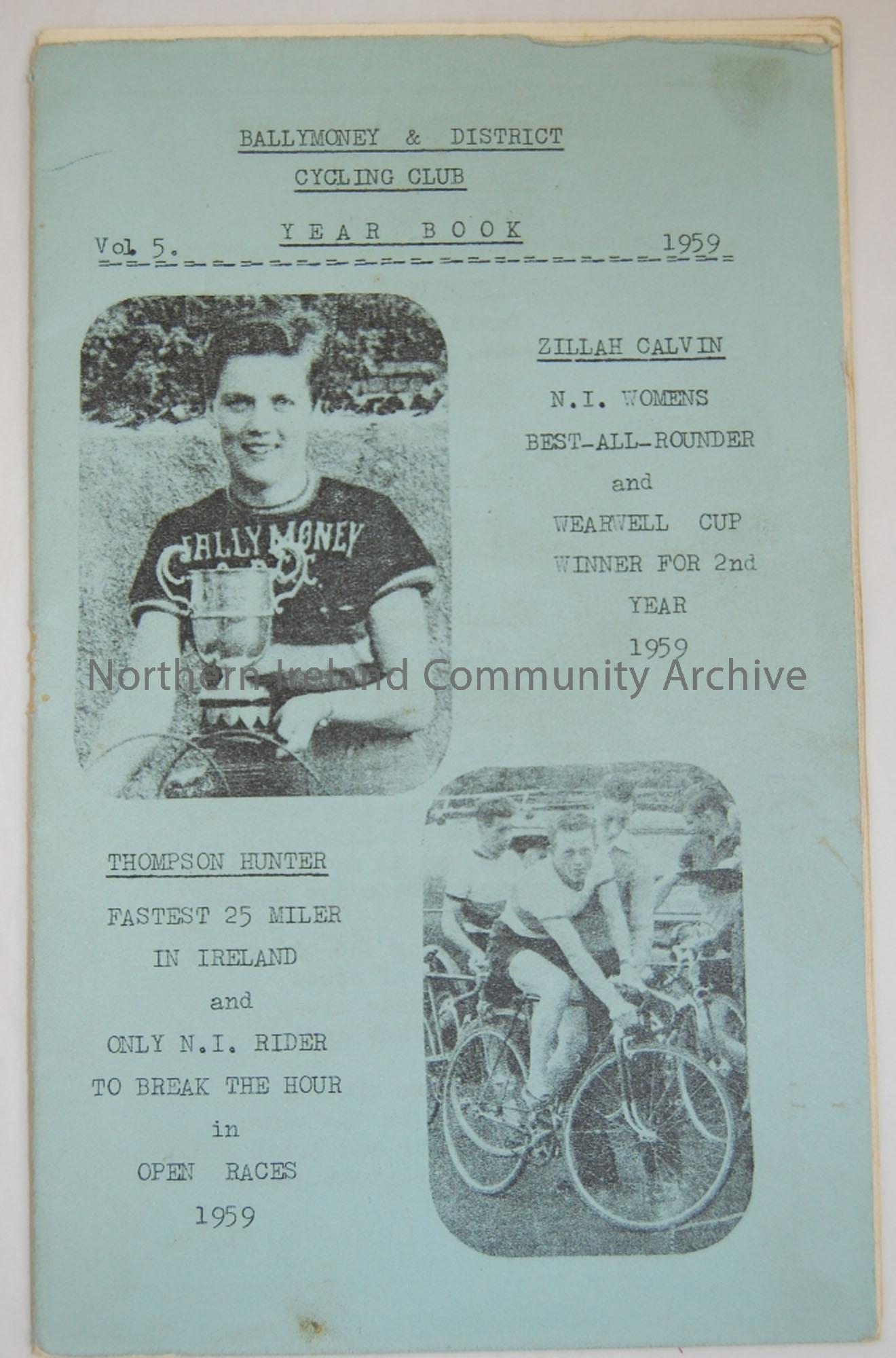 Ballymoney & District Cycle club year book Vol 5. 1959. With images on front cover including Zillah Calvin and Thompson Hunter.
