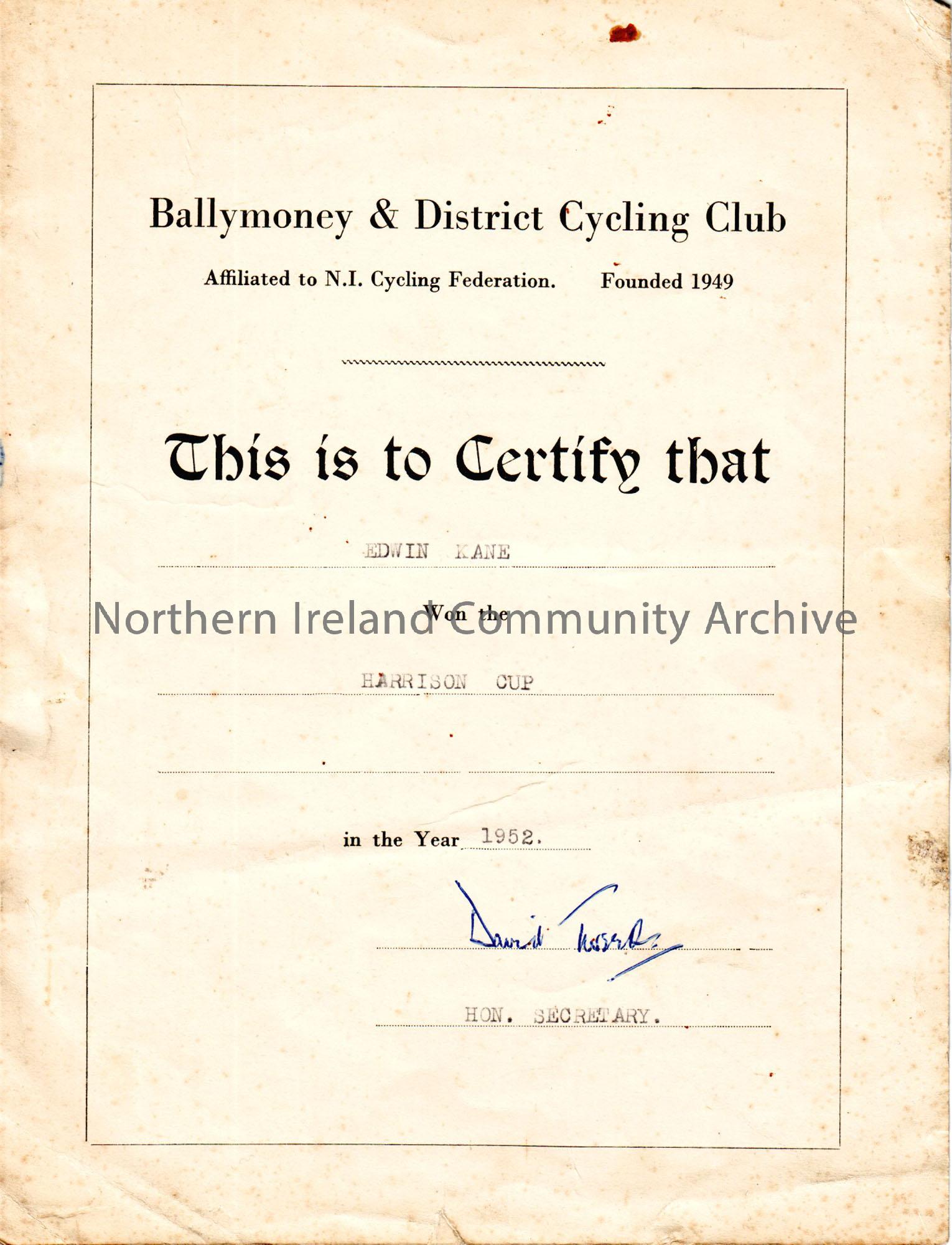 Ballymoney & District cycling club certificates won by Edwin Kane- Harrison Cup in 1952, Best all-rounder shield 1956 and 15 miles handicap shield 1957.