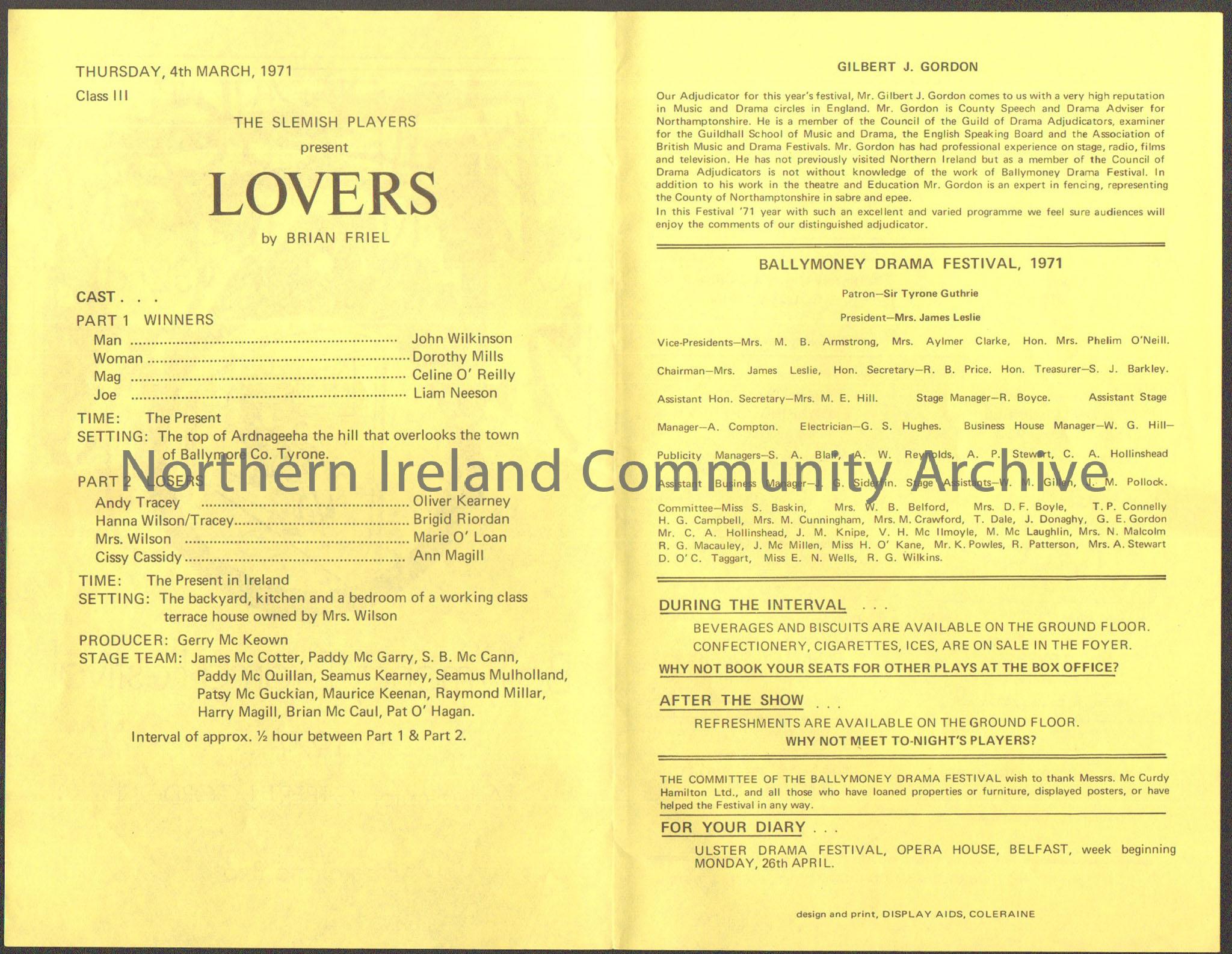 Ballymoney Drama Festival Programme 1971. Pastel green booklet with different coloured pages with an image of someone on a stage in front of a tower inside a stage lighting design.