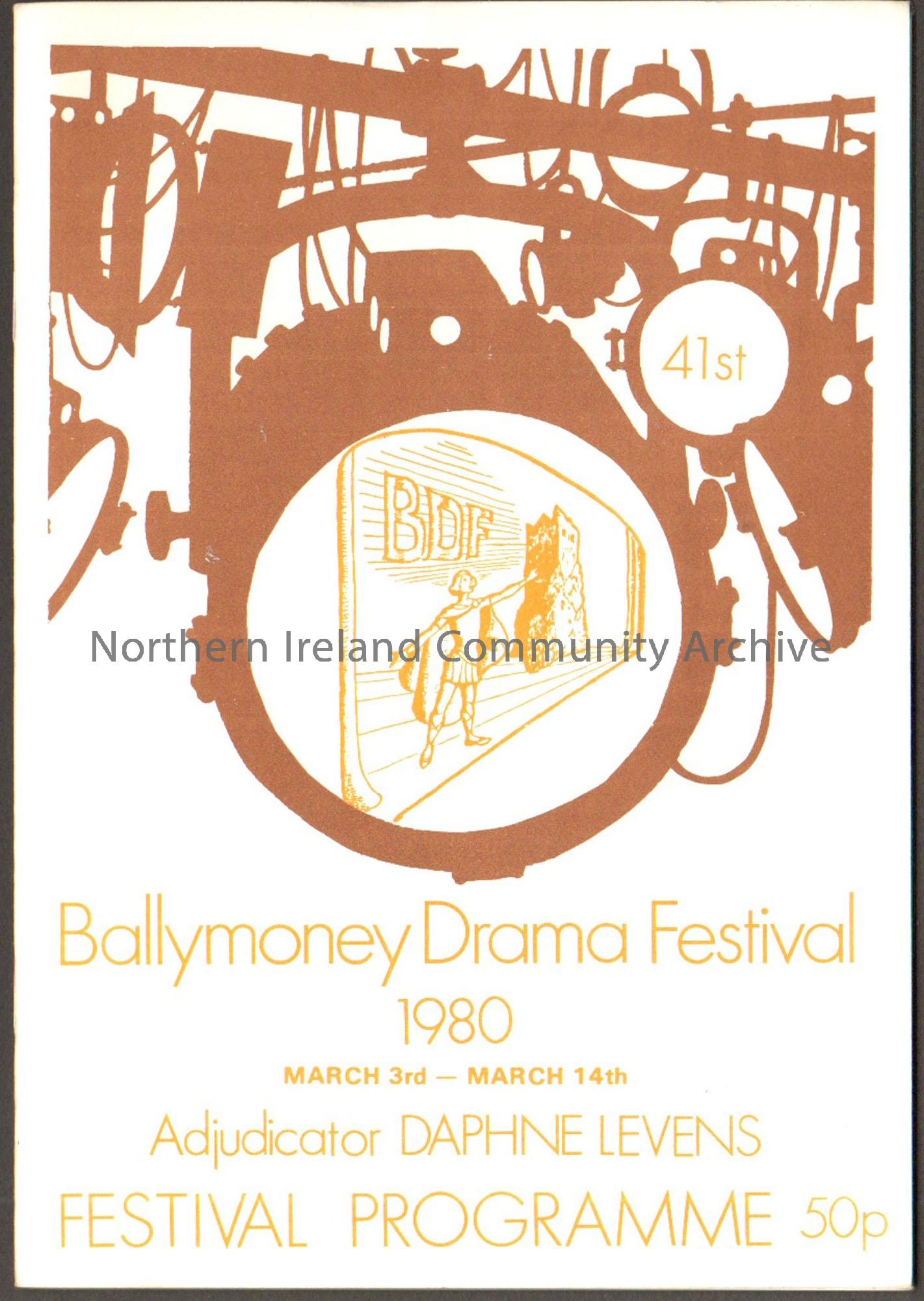 Ballymoney Drama Festival Programme 1980. White cover with orange writing with an image of someone on a stage in front of a tower inside a brown stage lighting design.
