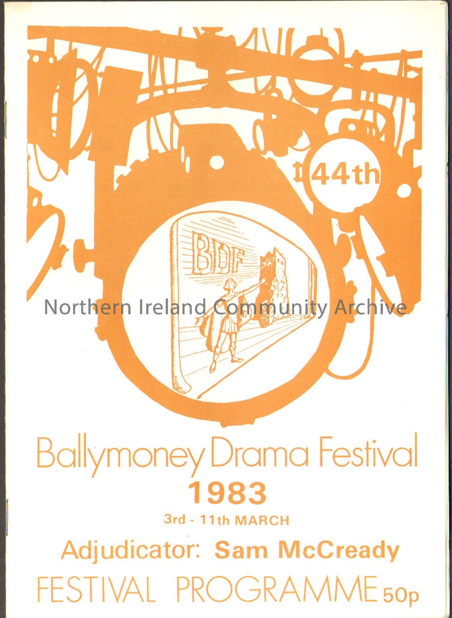Ballymoney Drama Festival Programme 1983. White cover with brown writing with an image of someone on a stage in front of a tower inside a brown stage lighting design.