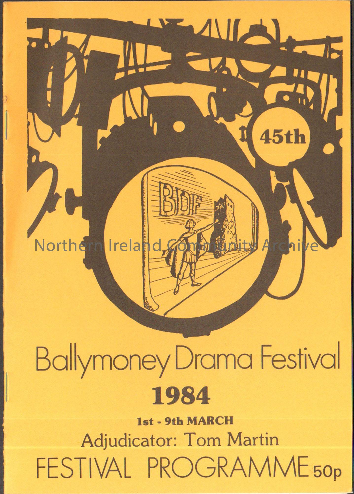 Ballymoney Drama Festival Programme 1984. Orange cover with black writing with an image of someone on a stage in front of a tower inside a black stage lighting design.