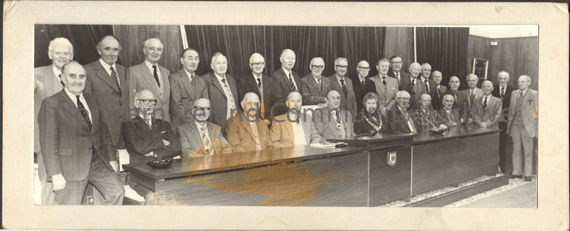 Ballymoney Probus Club at Mayor's Reception. Black and white photograph Group of men with Mayor Mollie Holmes lined up behind a desk on an off white mount.