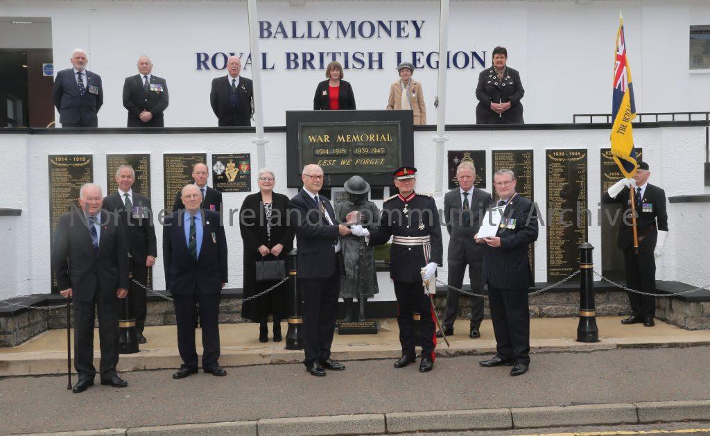 John Pinkerton and the Lord-Lieutenant for County Antrim Mr David McCorkell pictured at Ballymoney War Memorial with representatives of Ballymoney Royal British Legion where a special presentation took place in recognition of the Queen’s Award for Voluntary Service.