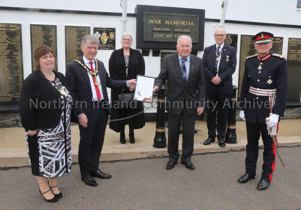 Bobbie Davis receives a certificate of recognition for his commitment to the Poppy Appeal alongside the Mayor of Causeway Coast and Glens Borough Council Alderman Mark Fielding, Mayoress Mrs Phyliss Fielding, Sue Pinkerton, John Pinkerton and the Lord-Lieutenant for County Antrim Mr David McCorkell.