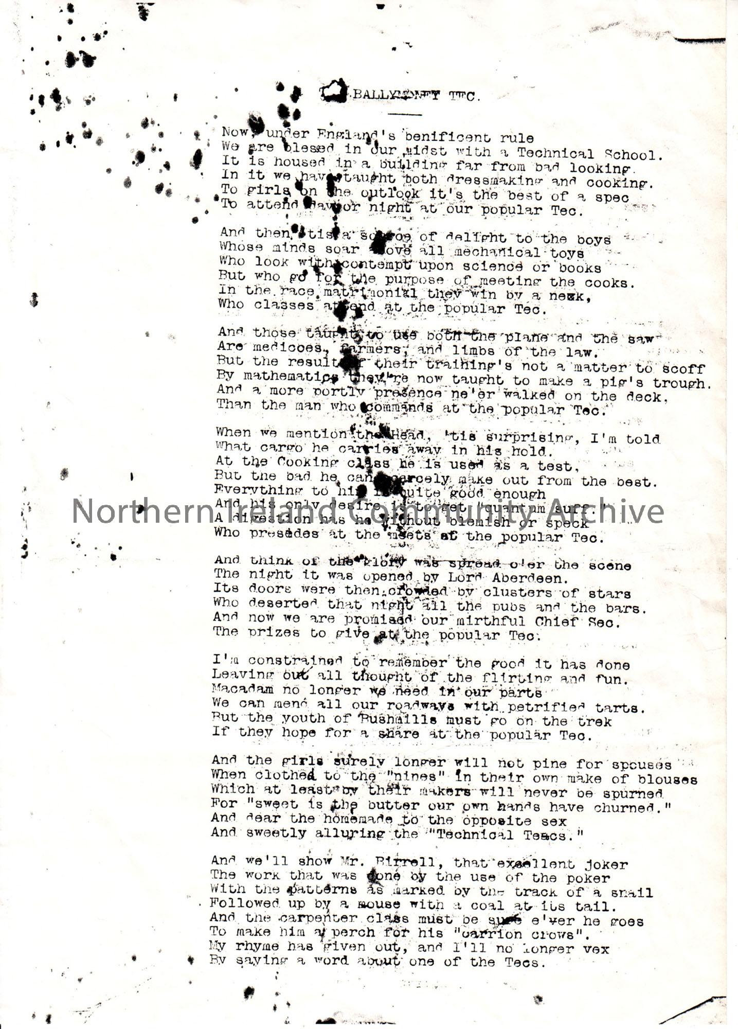 'Ballymoney TFC' poem written by donor's grandfather for the opening of the Technical school