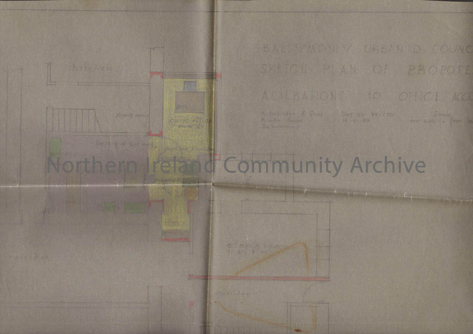 Ballymoney Urban District Council sketch plan of proposed alterations to office accommodation in Town Hall on A3 tracing paper