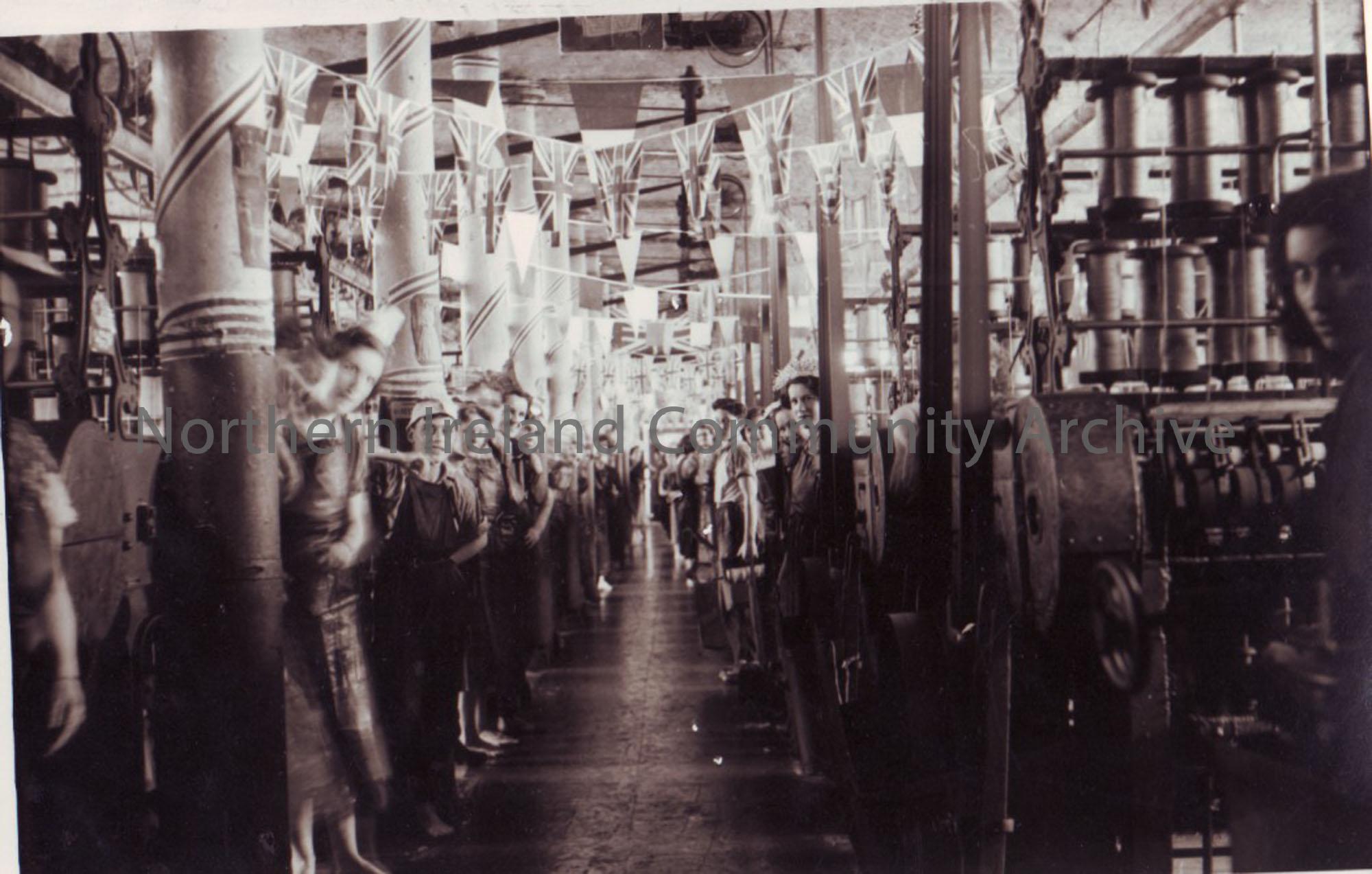 Balnamore Mill, room no.2 wet spinning, during Coronation 1953. Also contains envelope