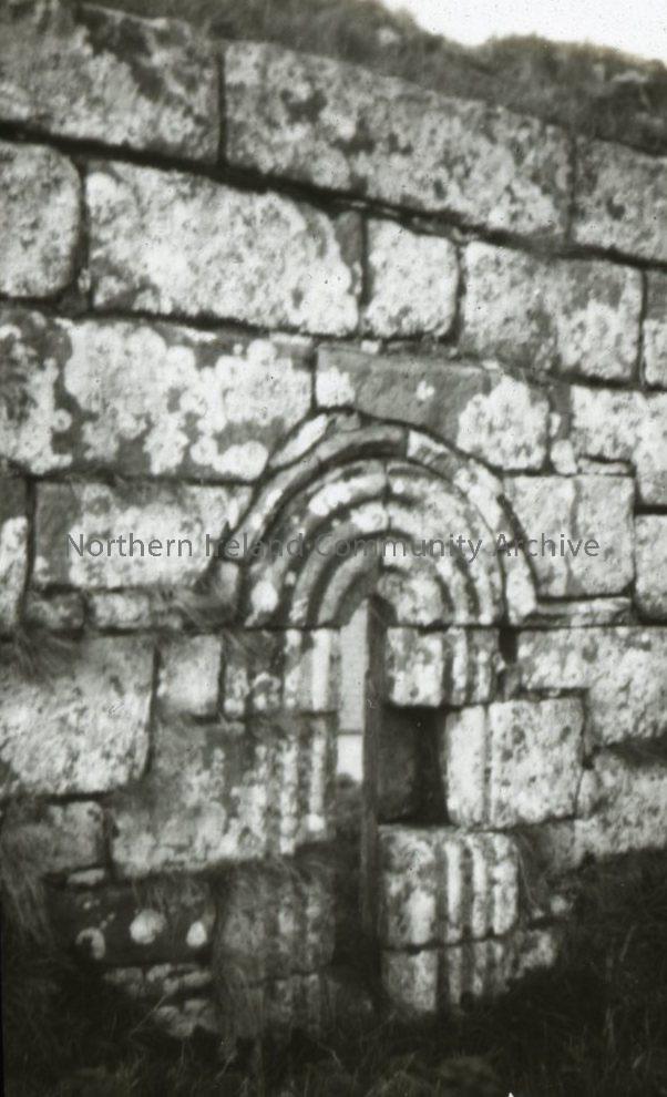 Close-up view of old external stone wall and decorative archway - Banagher