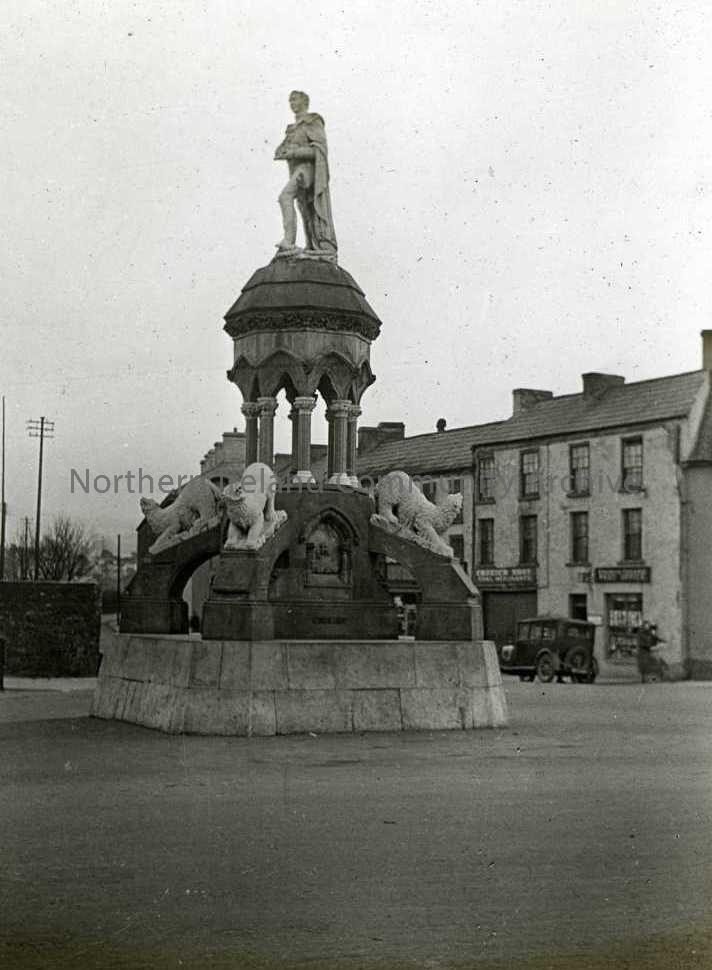 Crozier Monument in Church Square Banbridge. Date Built: 1862. Designed by W.J. Barre and statue and carvings by Joseph Robinson Kirk. Banbridge town's most famous son was probably Captain Crozier of North West Passage fame who was born in 1796 at a large house in the town's Church Square. After the ill fated voyage to discover the North West Passage a monument was erected in church Square Banbridge to commemorate this hero. The pedestal was designed in 1862 by W.J. Barre of Newry, who designed the Ulster Hall and Albert Memorial in Belfast, whilst the statue was carved by Joseph Robinson Kirk, of Dublin costing a total of £700.
