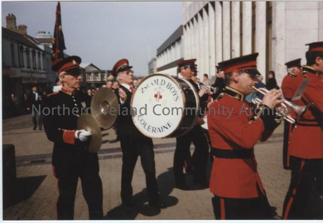 Band marching through the Diamond in Coleraine. A man is carrying a drum which has "2nd OLD BOYS COlERAINE" on it. Courtesy of Coleraine Museum.