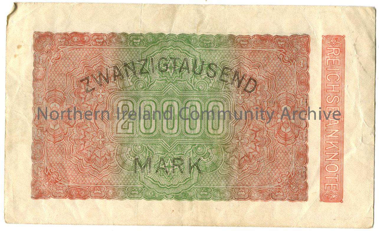 Banknote 20000 German Mark. Red and green stripe on a cream background with an intricate black border. Zwanzigtausend Mark written in Gothic style writing.
