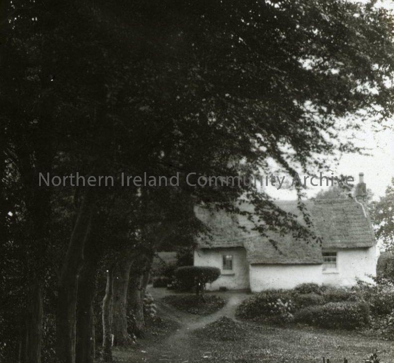 View of white thatched cottage along treelined path - Begleys