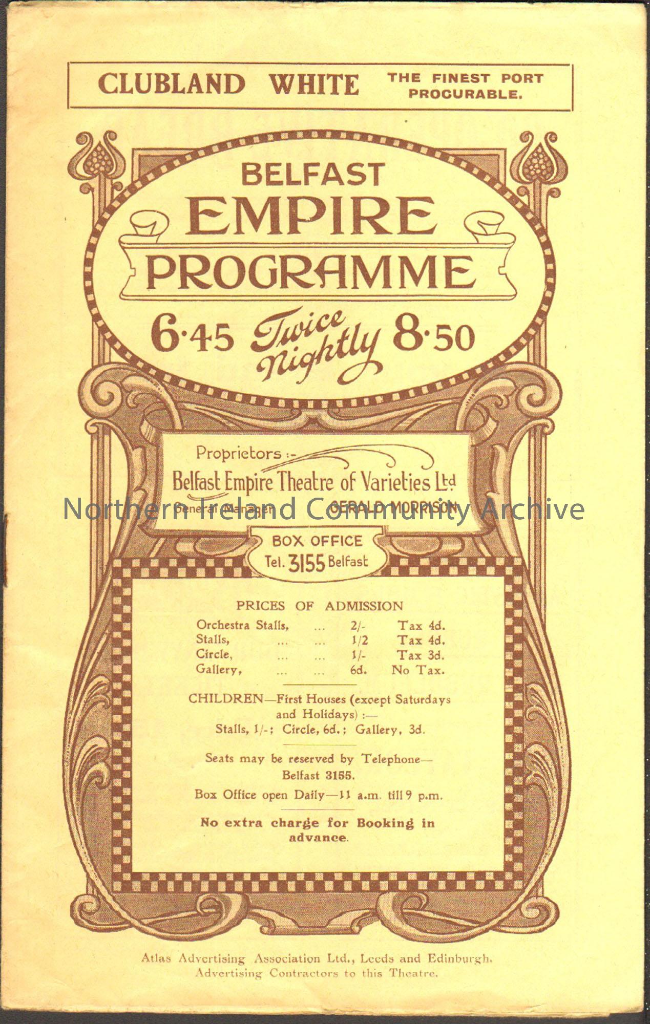 Belfast Empire Theatre programme 6.45 and 8.50 twice nightly, 11th April 1931. Cream leaflet with brown writing and decoration.
