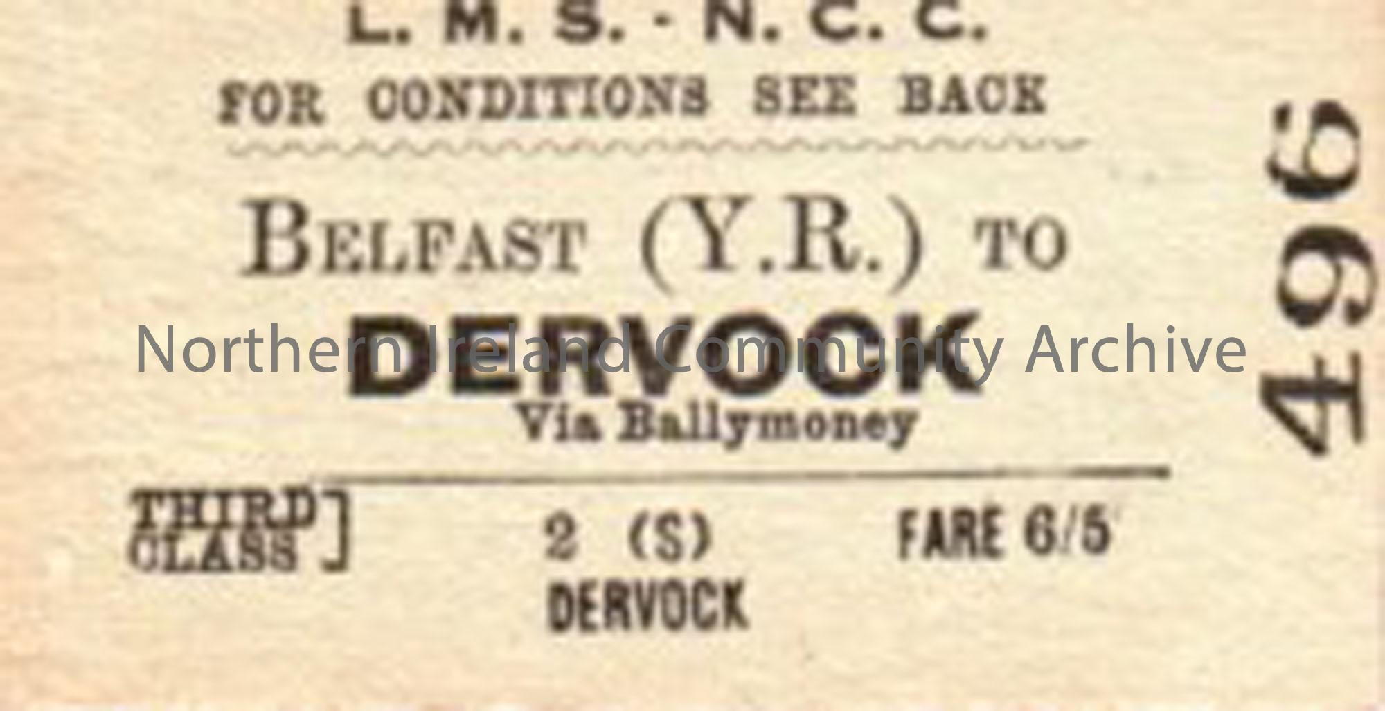Belfast (York Road) to Dervock via Ballymoney railway ticket. 3rd class, no date.Narrow gauge and standard gauge line.
