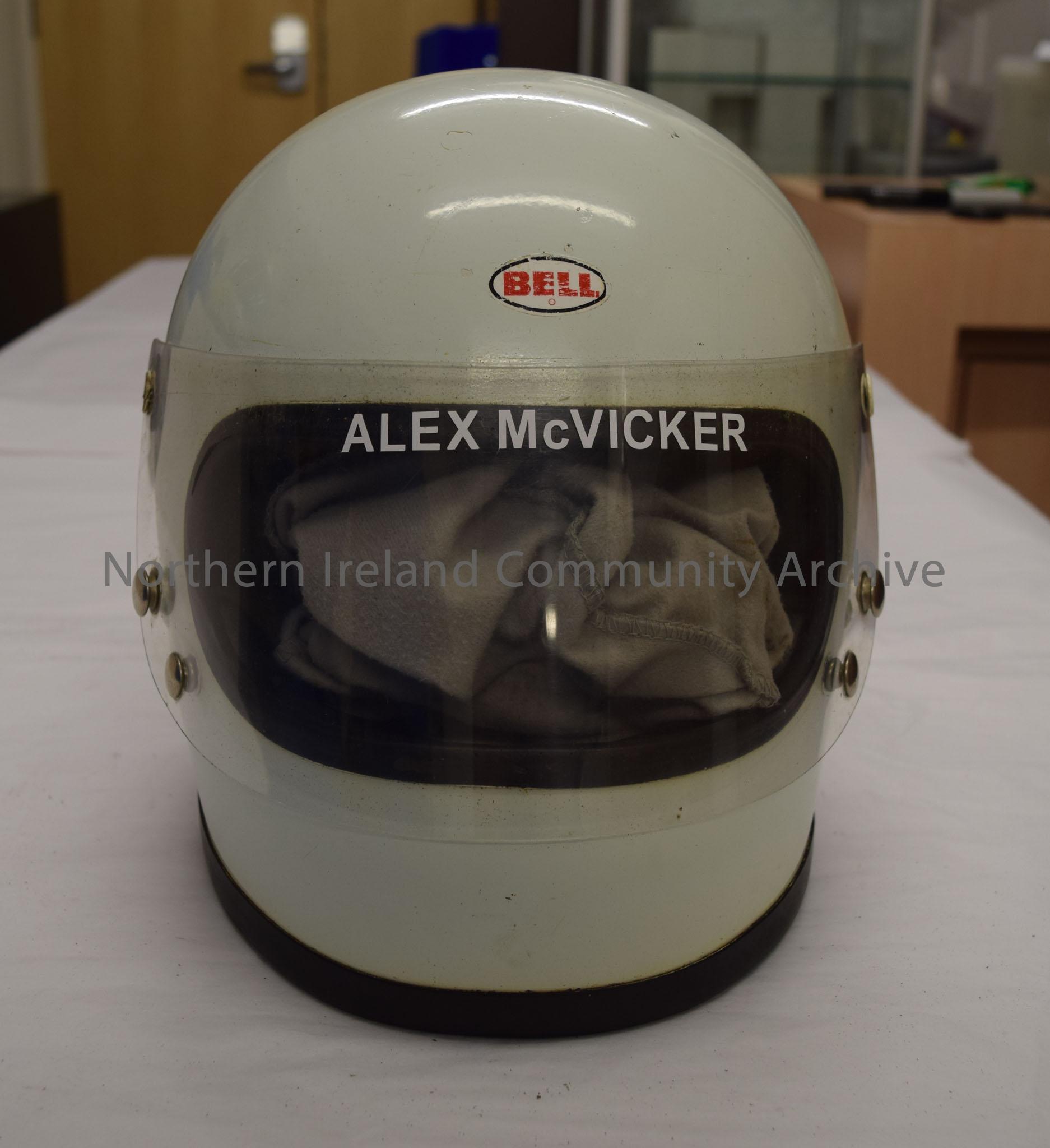 Bell motorcycle helmet belonging to Alex McVicker. Plain white helmet with “Bell” in red letters just above the visor. – 2016.61 (2)