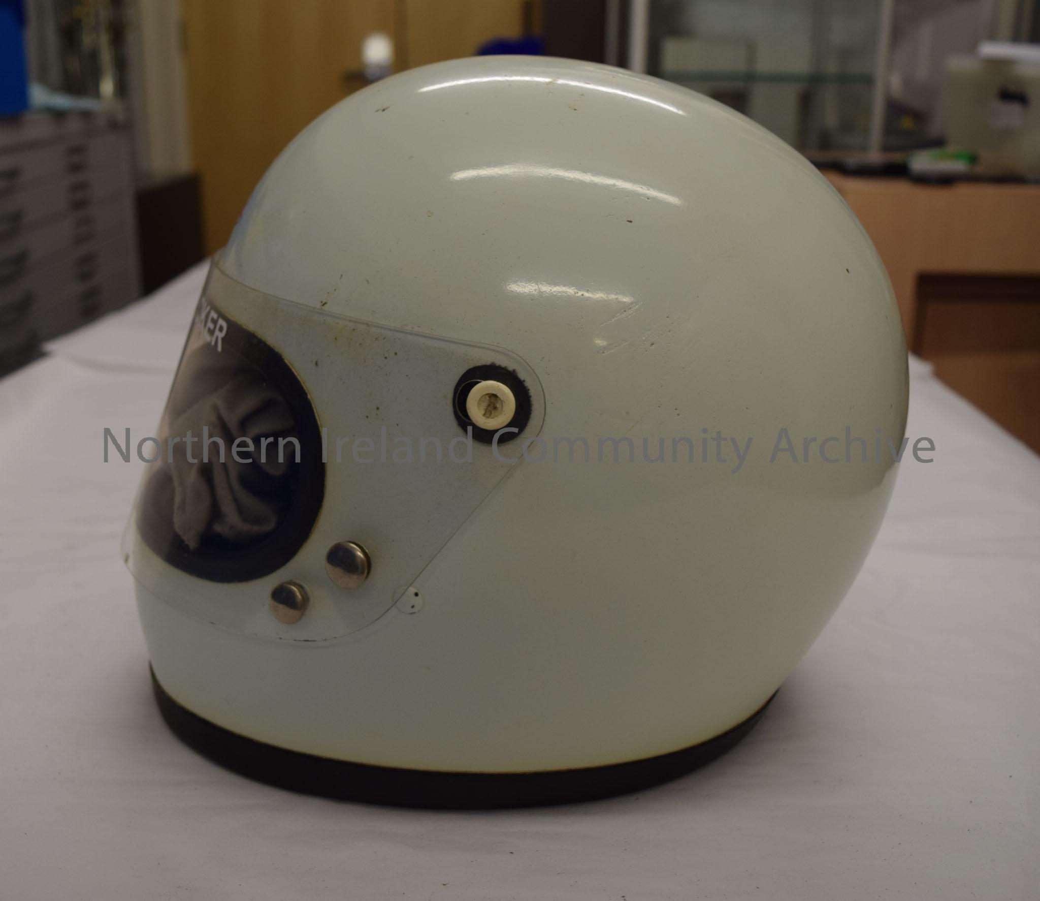 Bell motorcycle helmet belonging to Alex McVicker. Plain white helmet with “Bell” in red letters just above the visor. – 2016.61 (3)