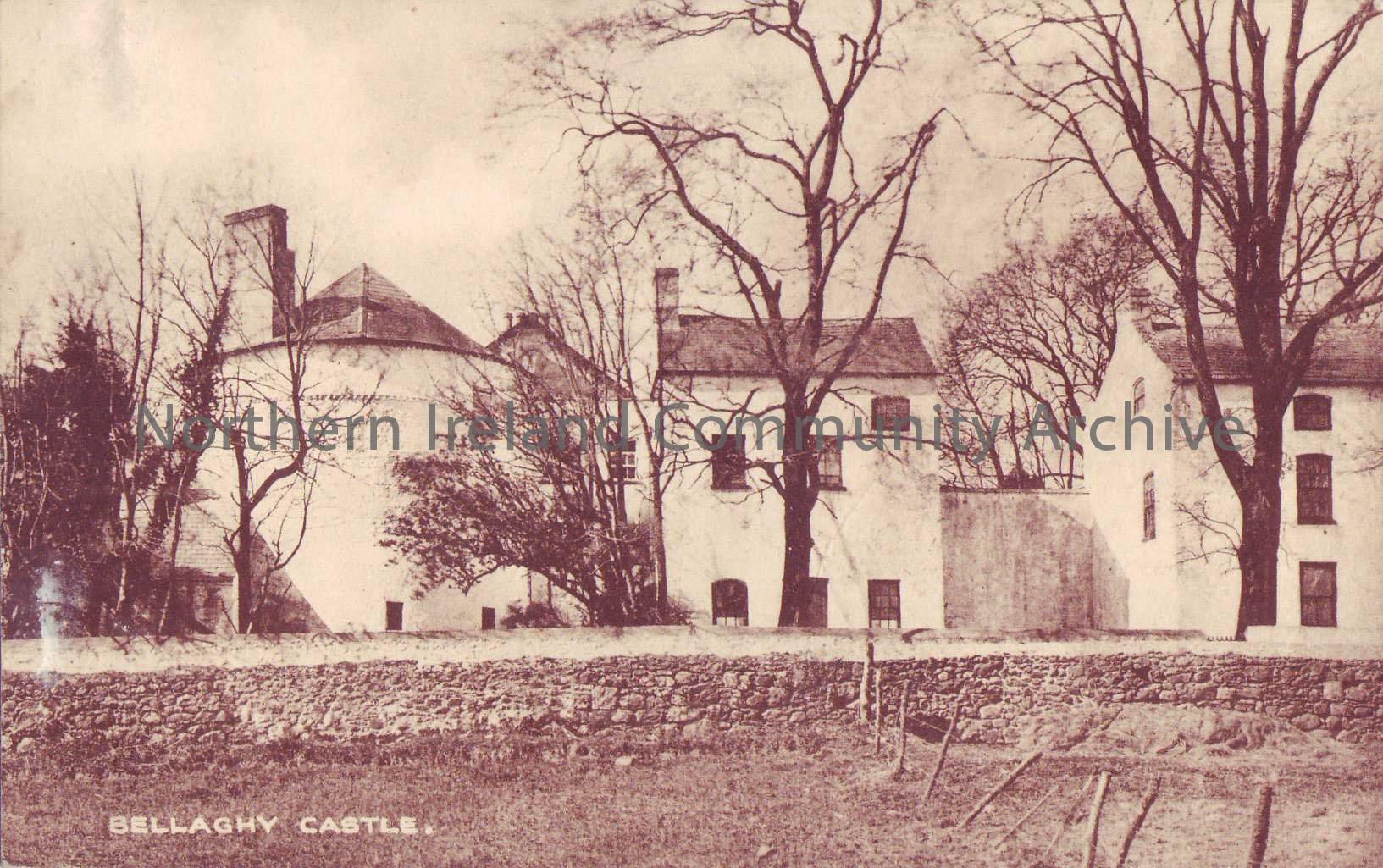postcard depicting Bellaghy Castle, with trees and white buildings