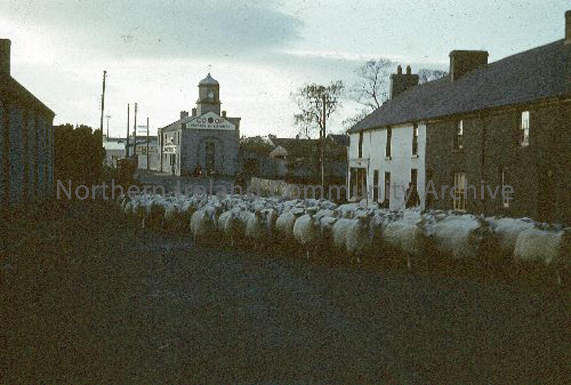 Bertie McCann herding sheep down Dervock Main Street, 1958