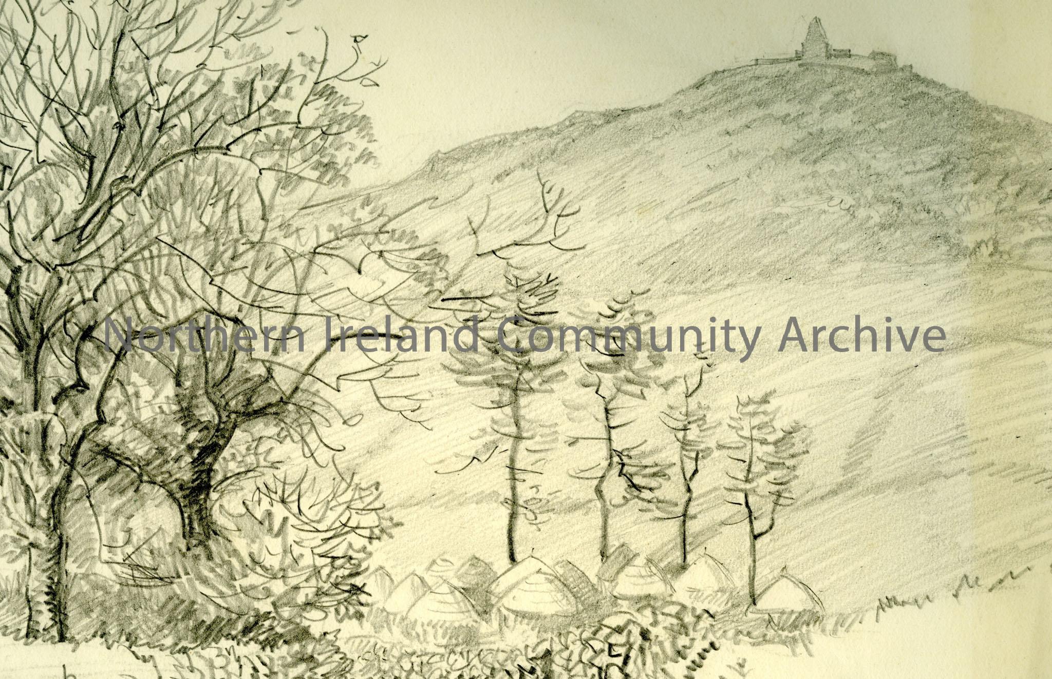 artwork titled, 'Between Slemish and Ballymena' by Hugh Thomson for 'The Fair Hills of Ireland' by Stephen Gwynn. Depicts mountain, hay stacks and trees.