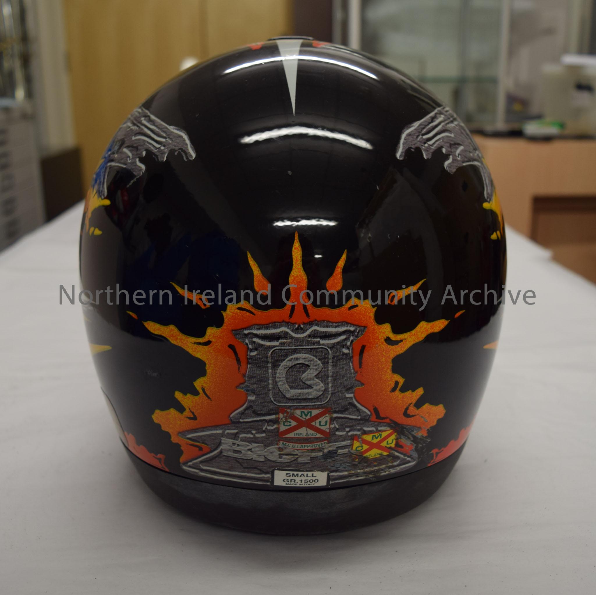 Bieffe motorcycle helmet belonging to Jeremy McWilliams. Black helmet with an orange and grey pattern on it. Small Light and dark grey checked pattern… – 2016.42 (4)