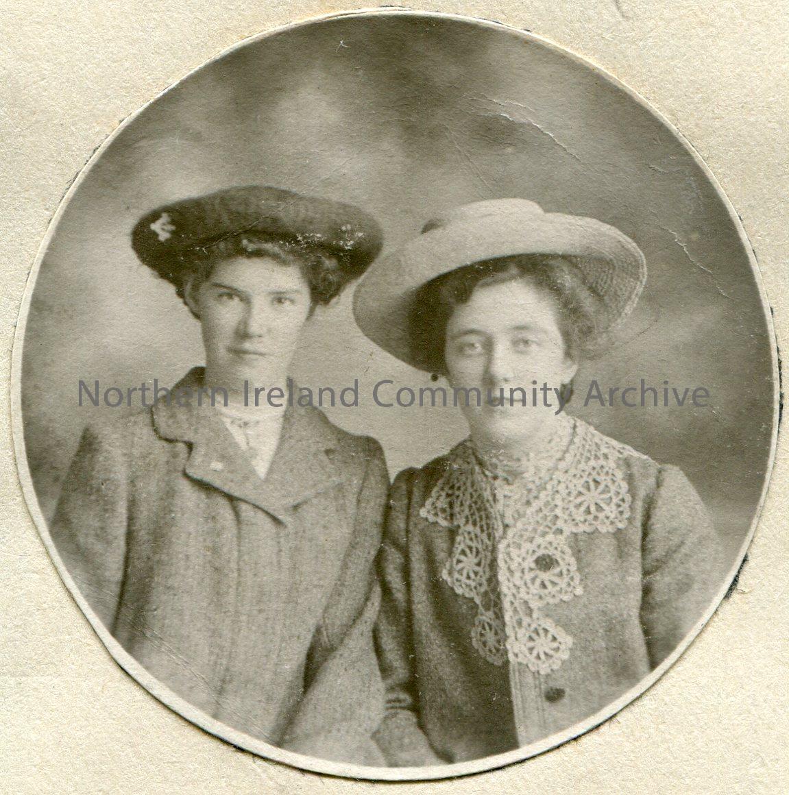 Black and white, circular photographic image captioned ‘Maggie Henry, Bertha Liken’ in pencil. Portrait image of two women wearing hats.