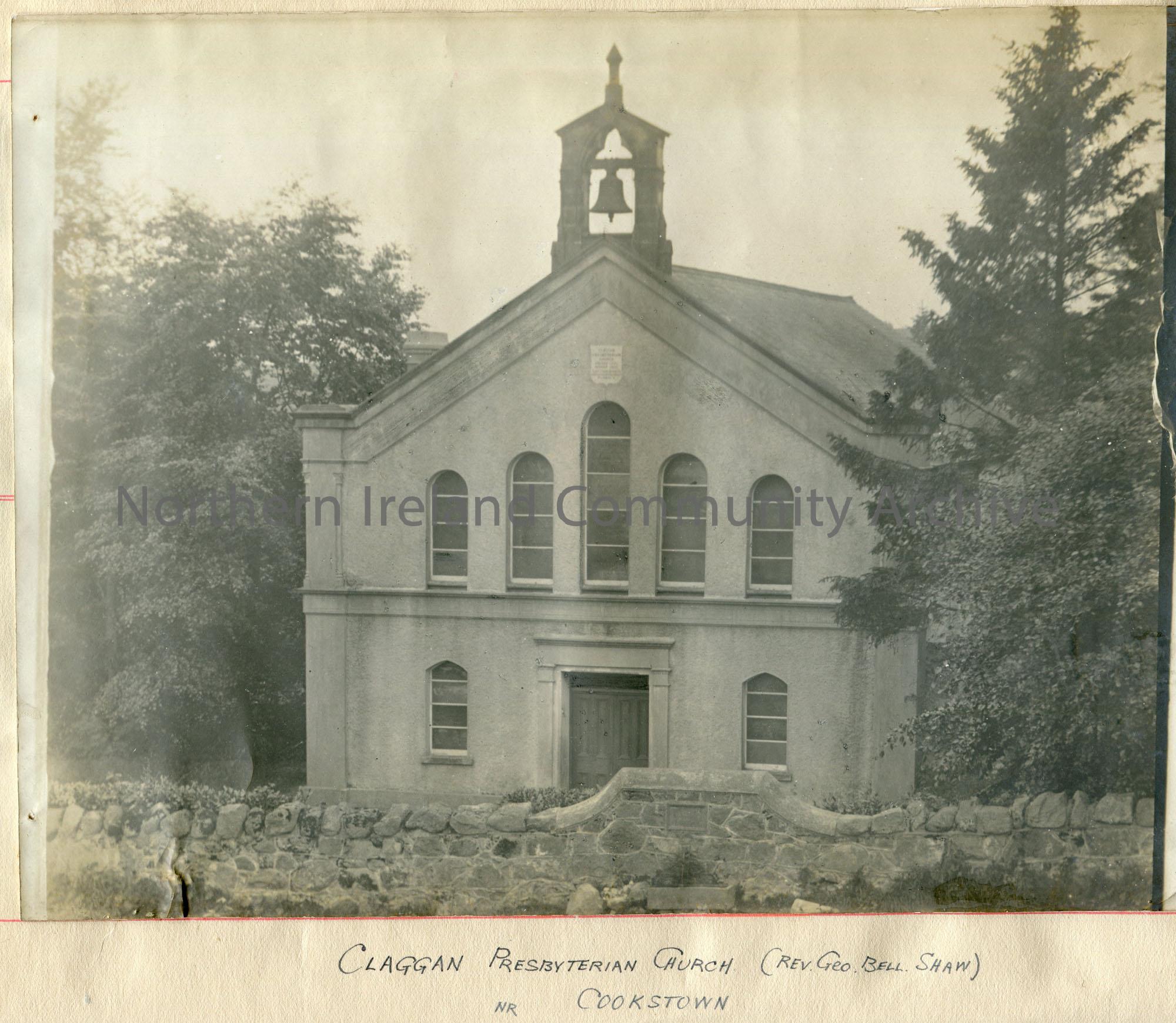 Black and white copy of a photograph captioned, ‘Claggan Presbyterian Church. (Rev. Geo. Bell. Shaw) NR Cookstown’.