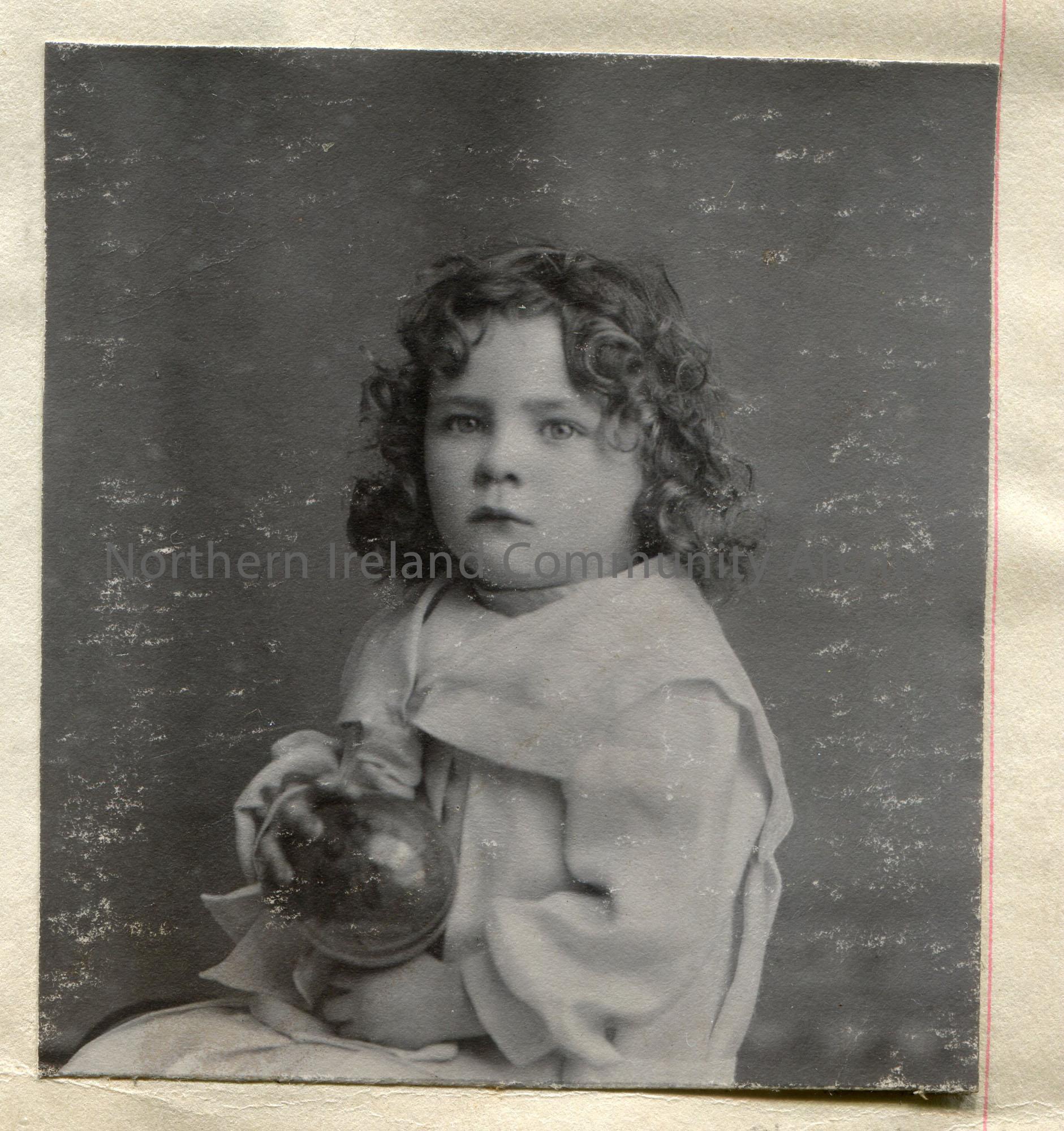 Black and white cutting of a formal image of a child sitting and holding a world globe. Captioned, ‘Steve Martin’.