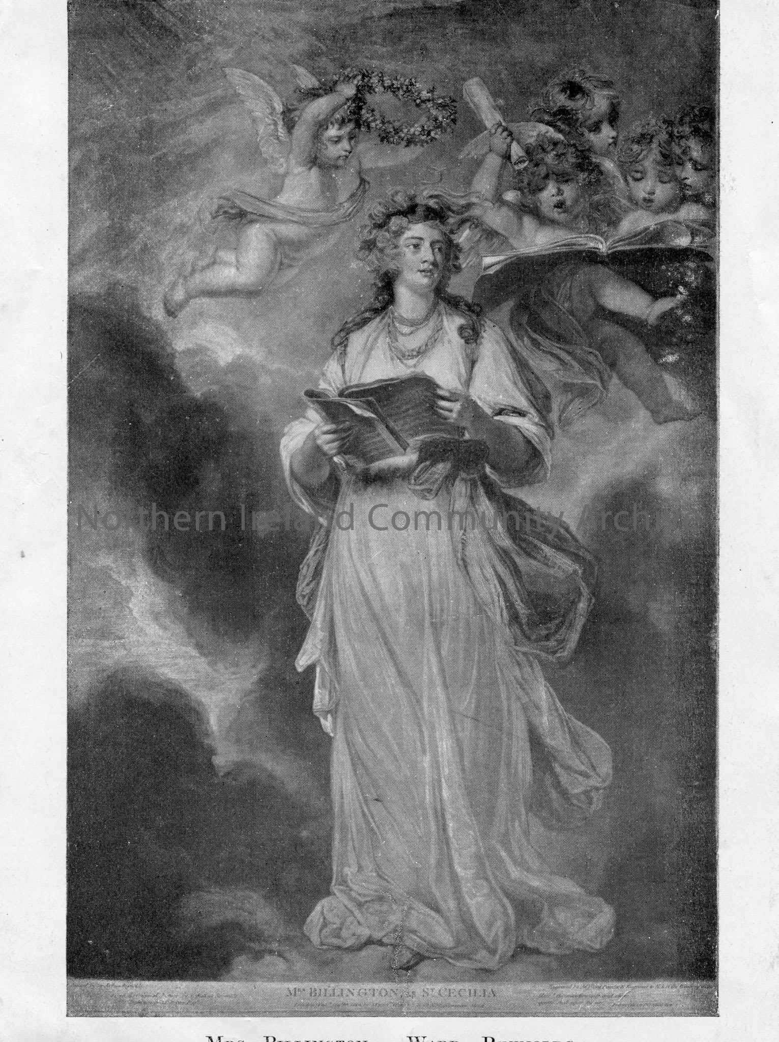 Black and white cutting of two photographic images, back to back. One is of a man seated and playing the violin or fiddle captioned 'Neil Gow'. The other is of a painting of a lady standing with children as angels above her head, captioned 'Mrs Billington. Ward - Reynolds'.