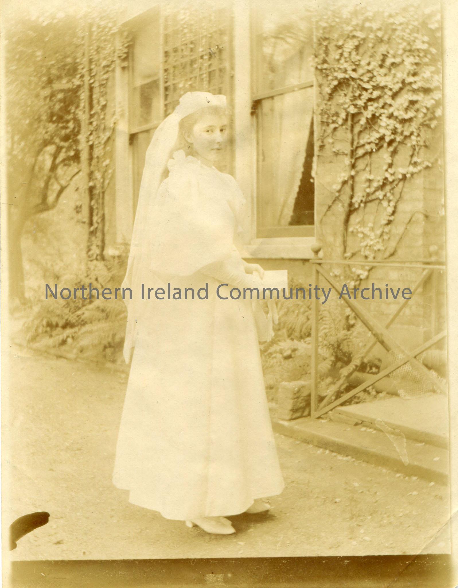 Black and white full length photograph of a young woman wearing long white dress with veil holding an open book.