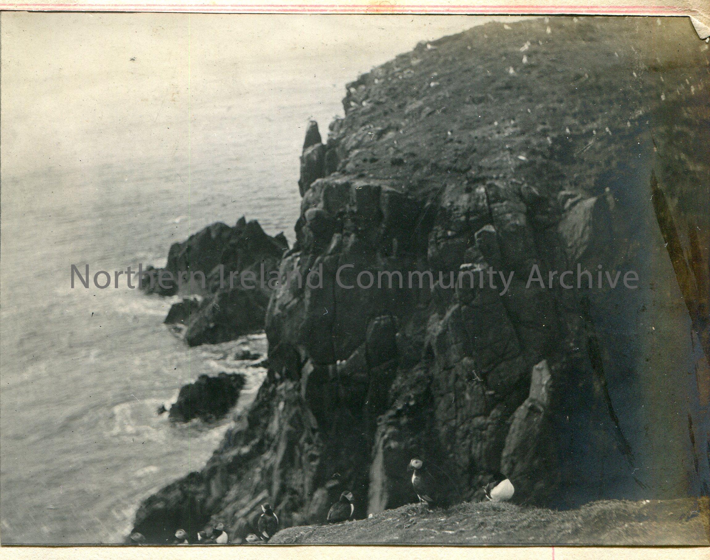 Black and white image of puffins on a cliff edge. Possibly at Rathlin Island.