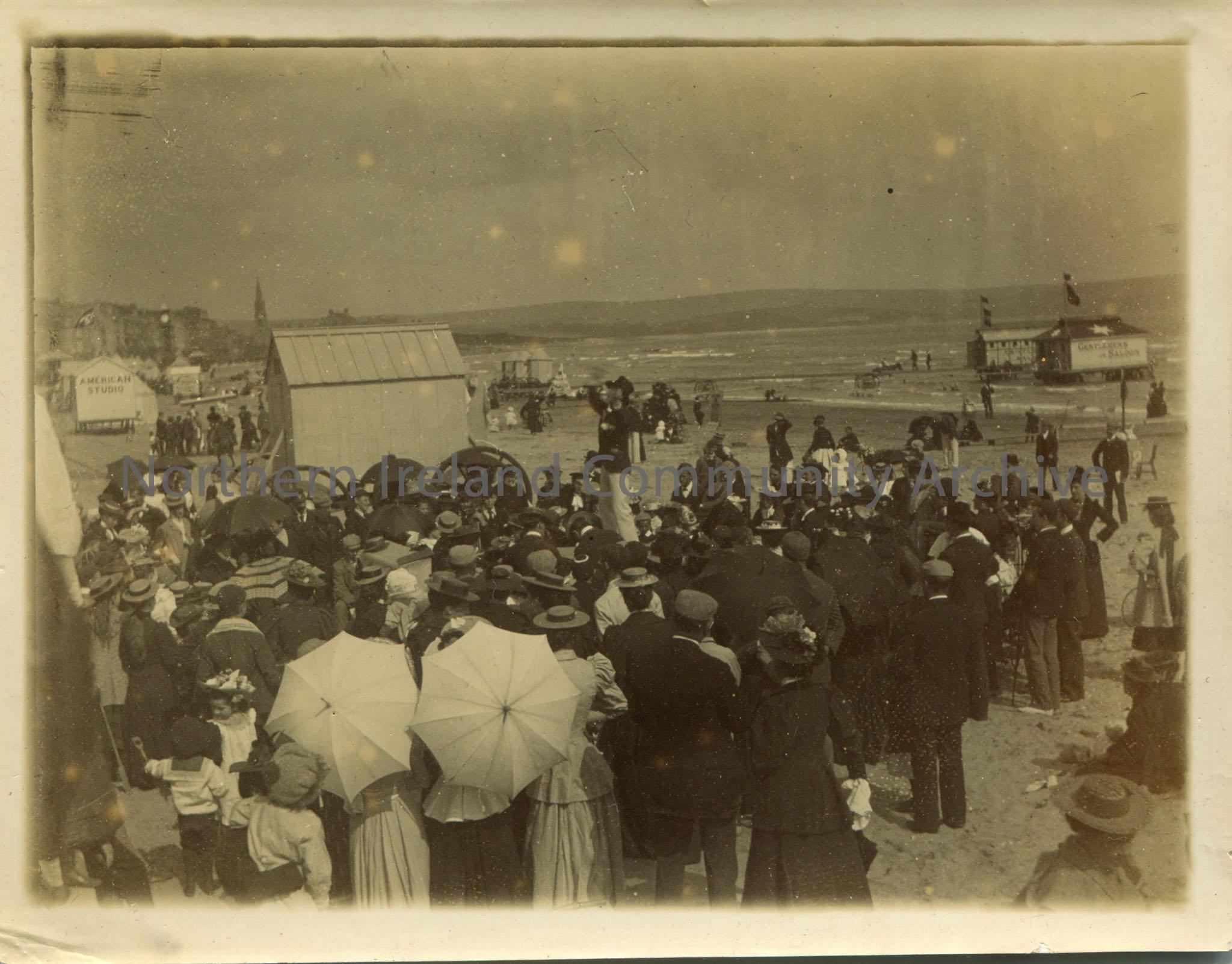 Black and white landscape photograph of a crowd at a beach watching a man perform. Gentleman's Saloon hut in the sea in the background.
