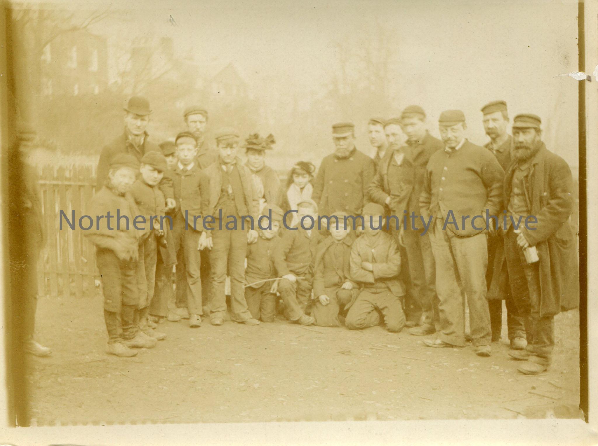 Black and white landscape photograph of a group of men and children inculding a woman and girl in the centre. Buildings in the background.