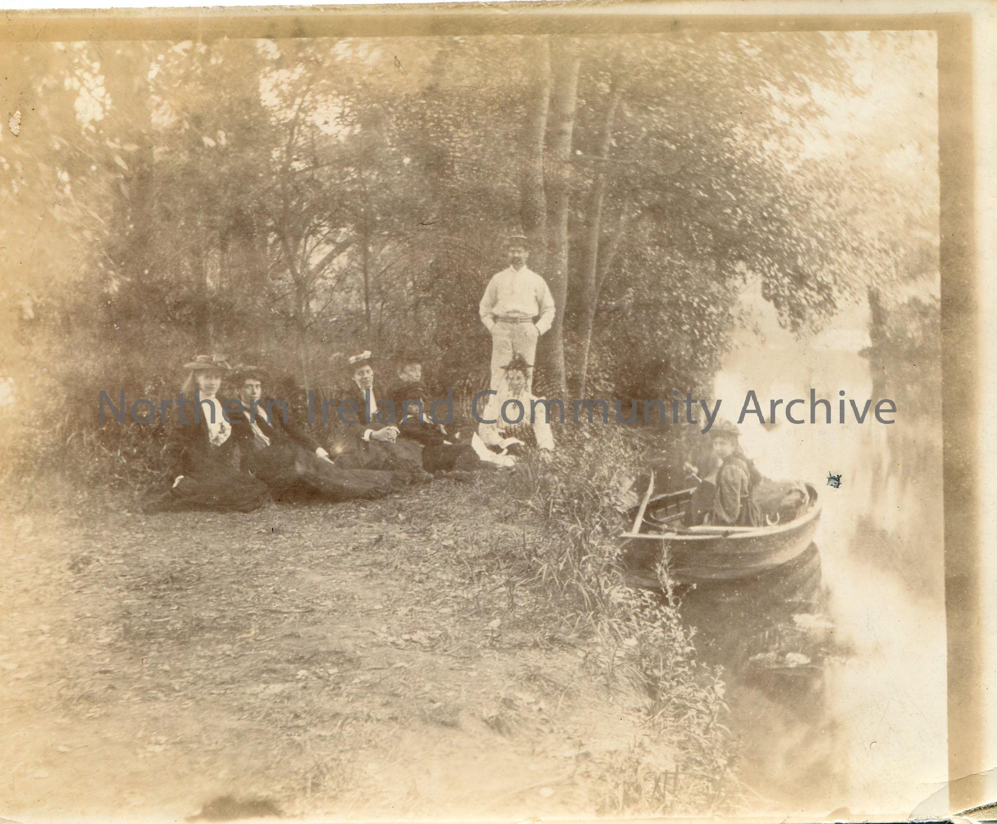 Black and white landscape photograph of eight men and women on a river bank. A woman is sitting in a boat on a river.