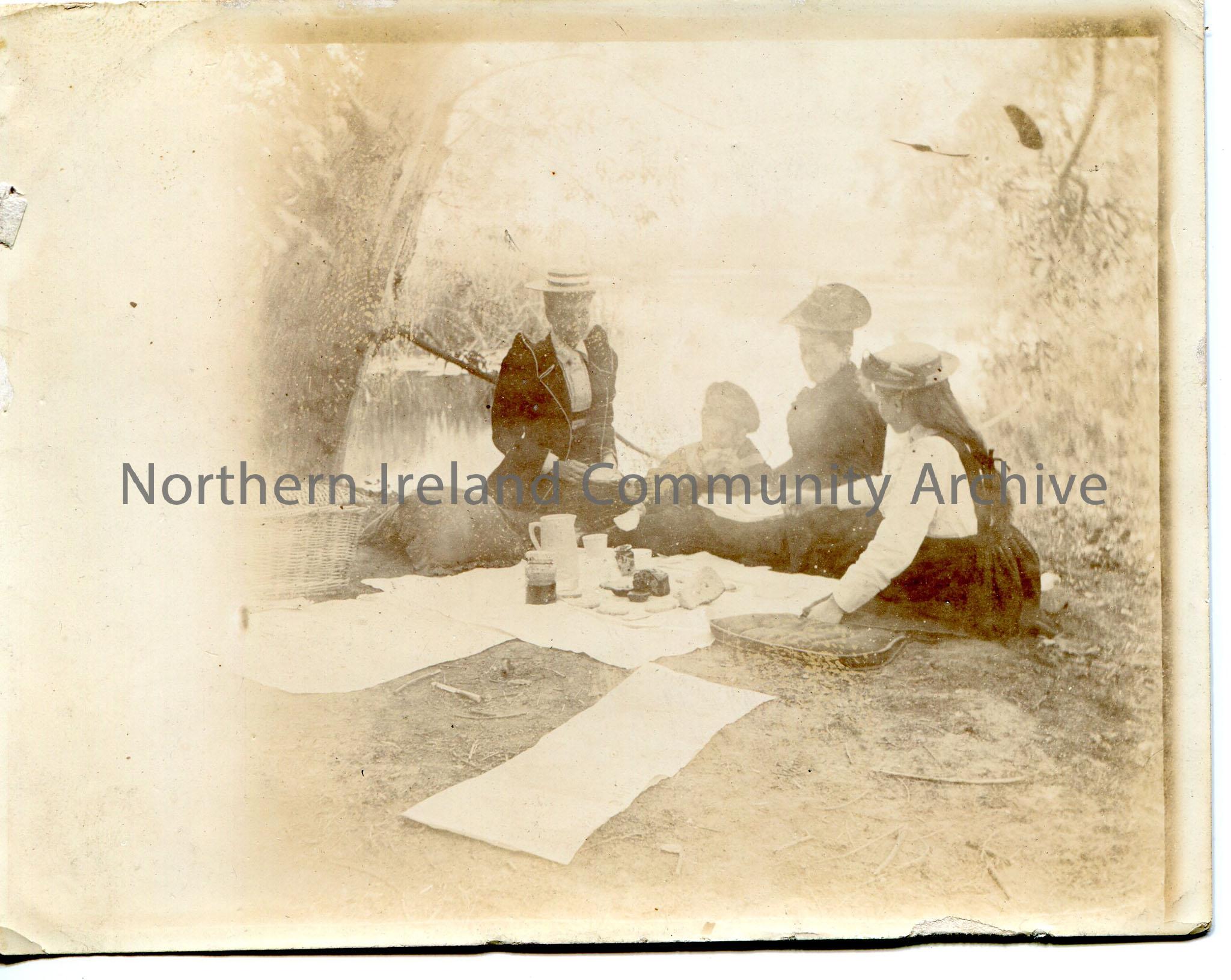 Black and white landscape photograph of two women and two children having a picnic beside a lake or river.