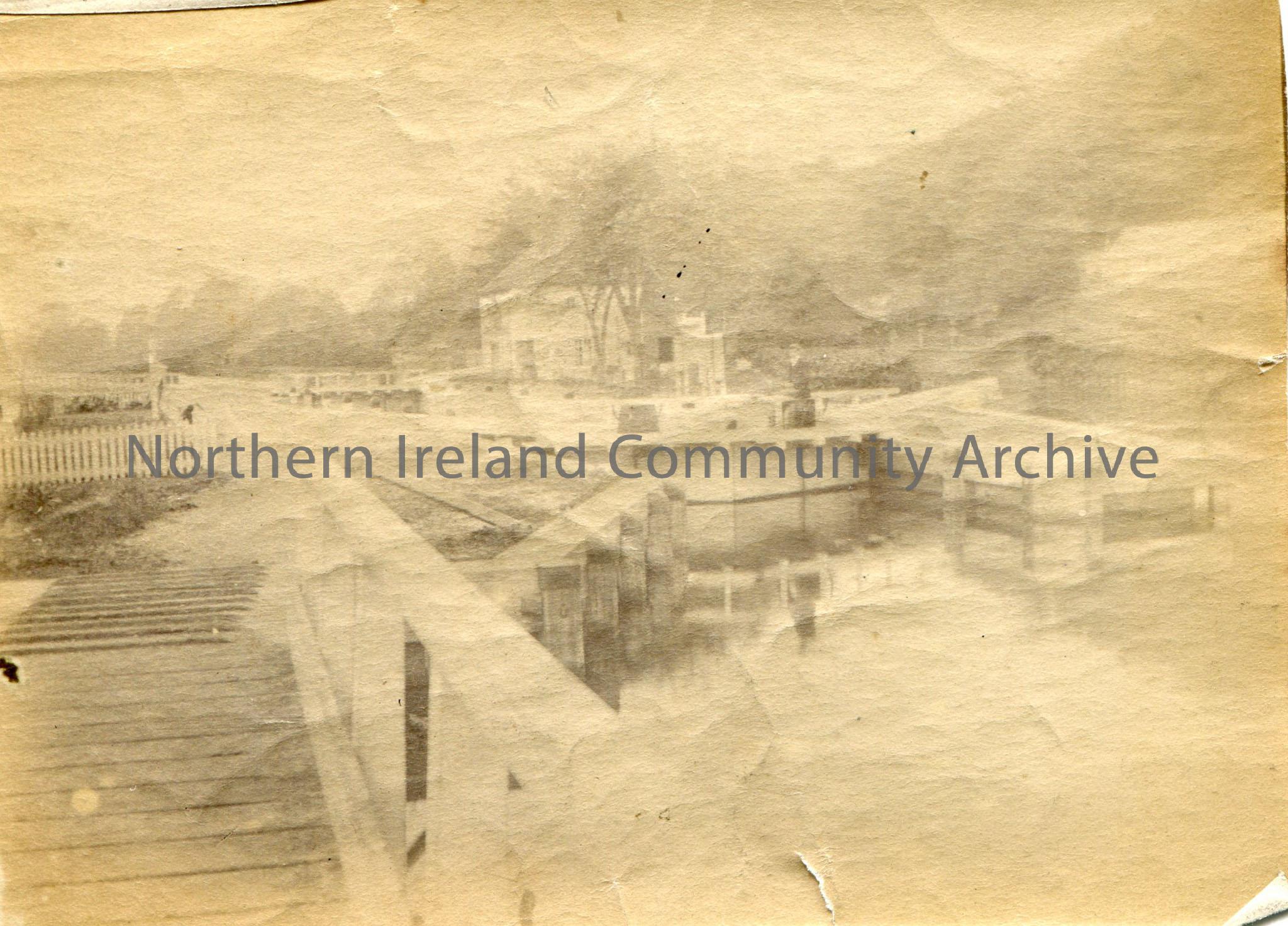 Black and white landscape photograph, or copy, of a boat dock with a man sitting on the edge of a rail. 92 handwritten on back of photograph.