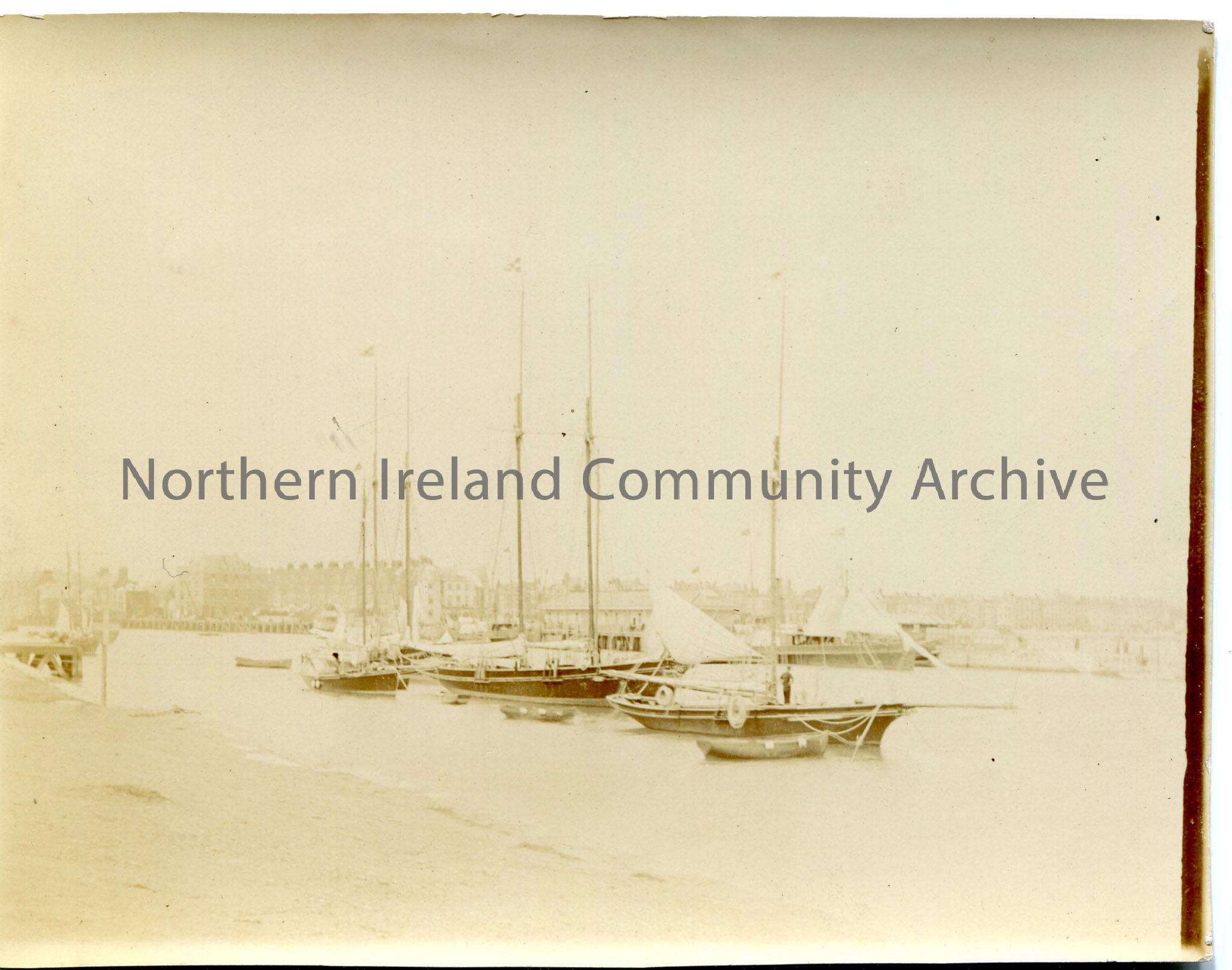 Black and white landscape photograph titled ‘No 184’. September, 1894. Image of sailing boats in a harbour.