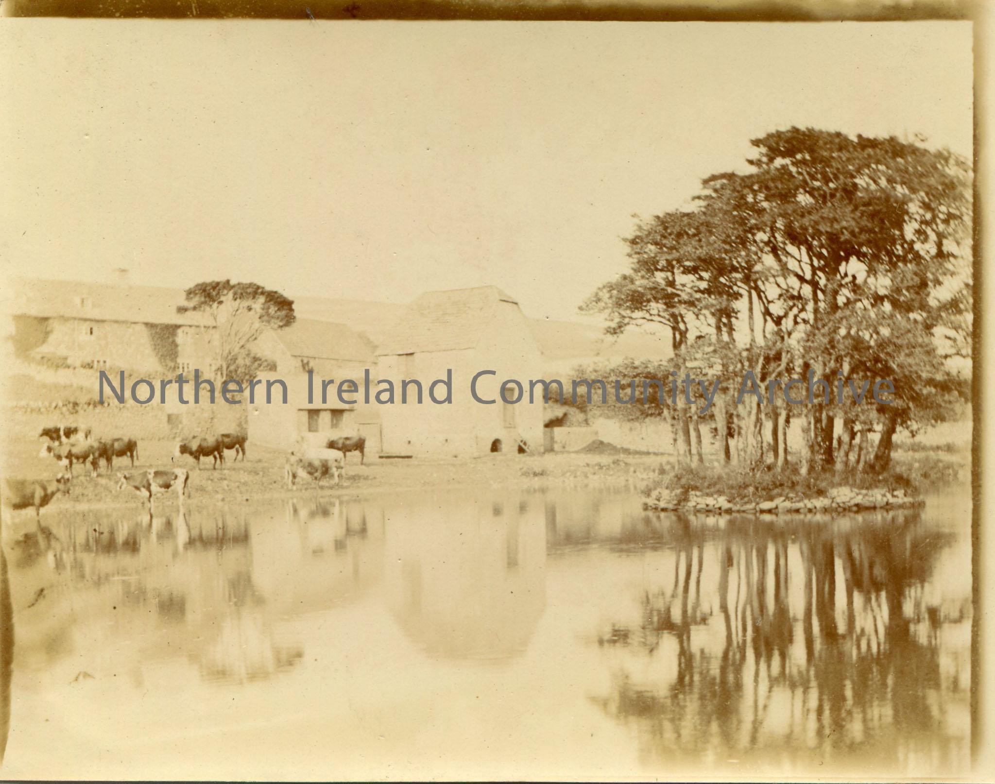 Black and white landscape photograph titled, ‘No 189’. Dated September 1894. Image of cows beside a lake with farm buildings in the background.