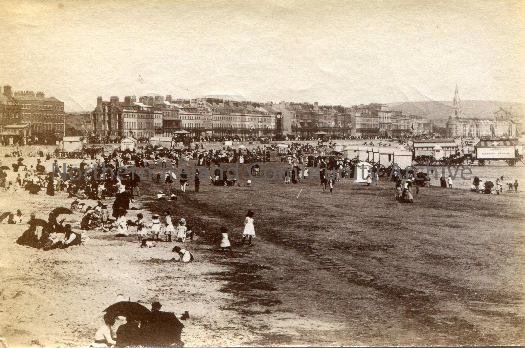 Black and white landscape photograph titled ‘Weymouth Sands’. Image of lots of people on a beach. Row of town houses in the background.